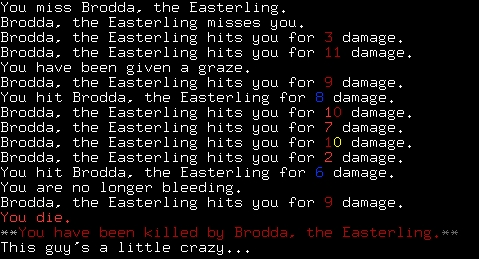 Нашел вход в Orc Cave. Если кому интересно, координаты 31 25 (слева-внизу от Bree). Веселый данжен. Докачался там до 24 лвла. Если кто-то хочет начать играть, могу отдать стартовые вещи (кольцо Free Action, золотишко, реколлы, прочая лабуда). Писать в приват в игре можно таким образом: "Кому: сообщение".