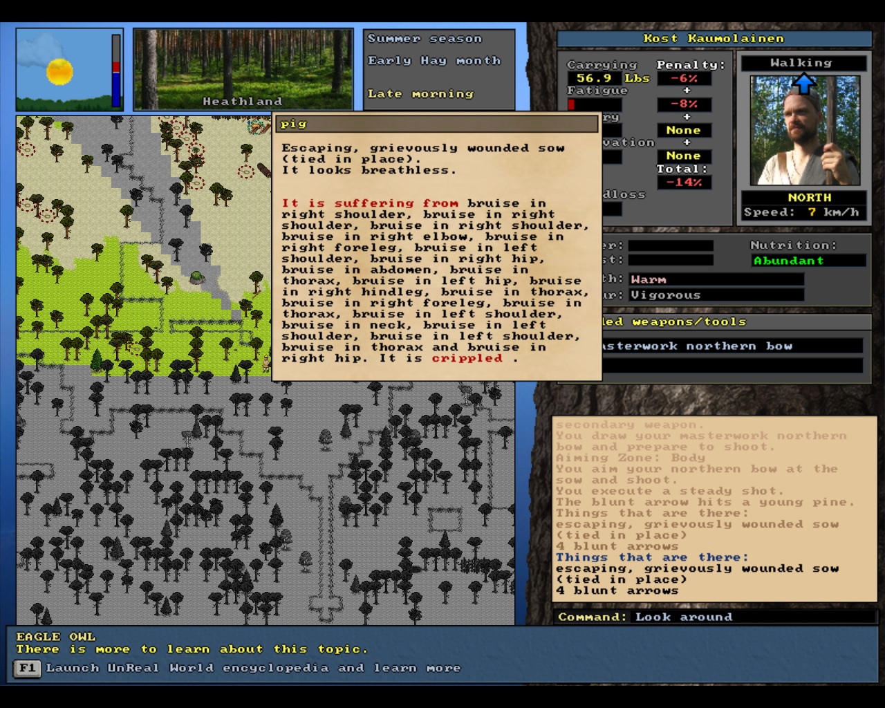 В пути встретил диких свиней. Последопытил, пытаясь выискать удобное расстояние для стрельбы с лука (навык низкий), стрельнул в одну свинью - попал в другую. Бегу к добыче пока она в отключке лежит. Хрясь! Со спины меня кто-то бьёт в плечо...