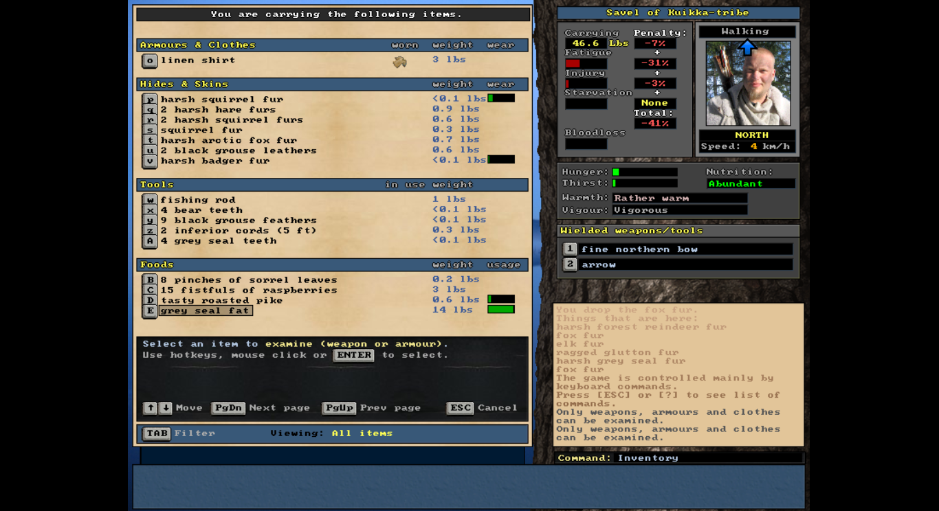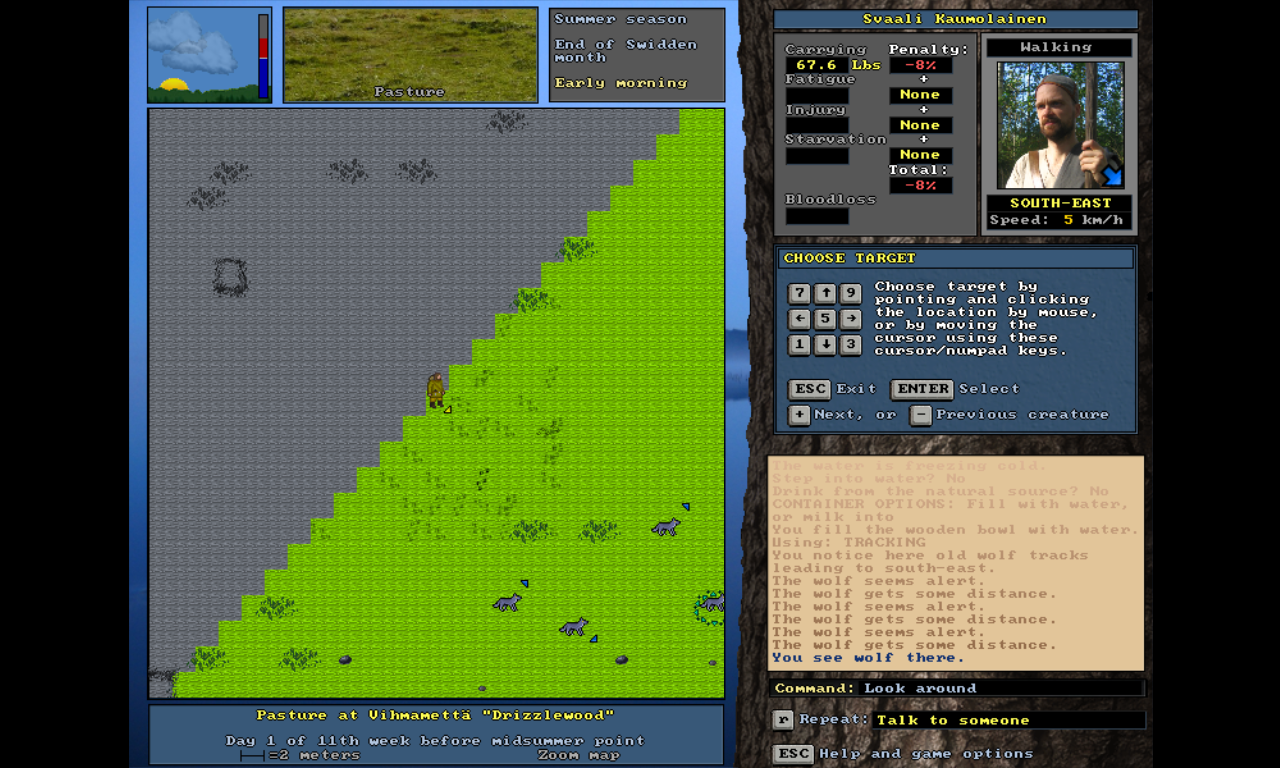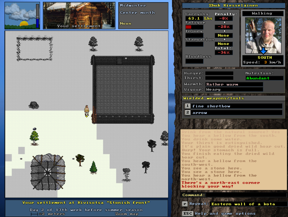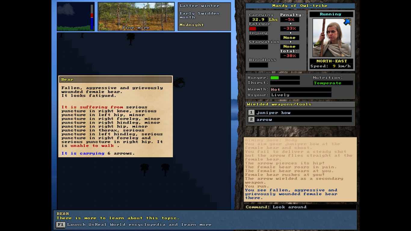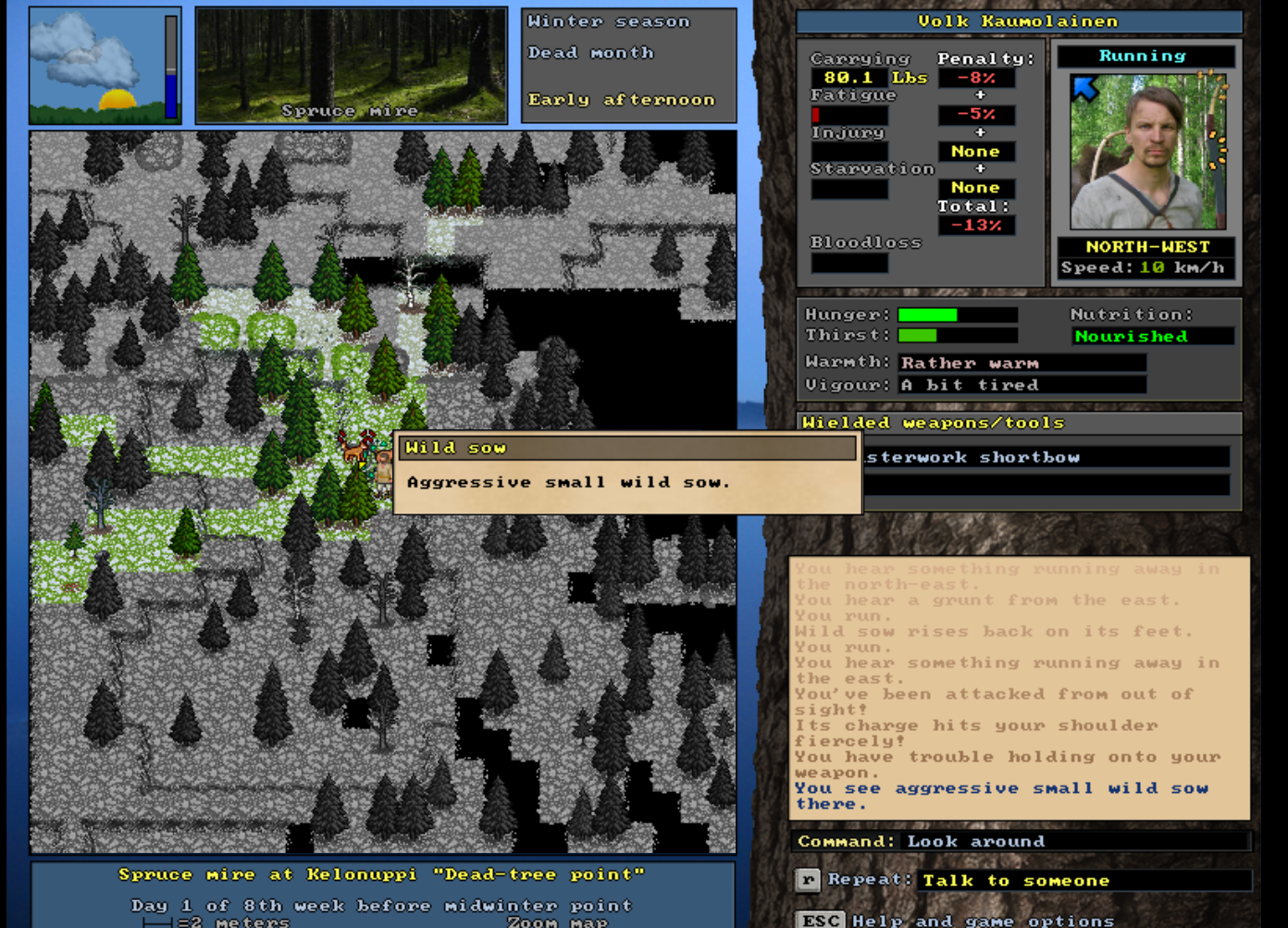 В общем обычно, если ты одет не по зимнему и/или без брони то это GG-WP с первой царапки, истечёшь кровью или доберут. В тяжелой одежде шансы есть но тоже рулетка. Мохнатые пидоры ведут себя как ИРЛ волки (в отличие от лонгдарка например), уходят из твоего направления взгляда, кайтят, кидаются со спины и одновременно с разных сторон. Нужно быстро пробежать пару шагов до локальной возвышенности с лучшим обзором и стараться иметь хотя бы с одного боку дерево. Достать их по сути можно только выстрелами, но лук со стрелами занимает обе руки и в ближке чувак беспомощен же? Нет. На помощь приходит волшебная кнопка 0 олицетворяющая собой могучий пинок. По какому то странному капризу кидающиеся волки _не_ боятся стрел или например ножа но получив пинок в нос на пару ходов разагриваются в частности пропустив собственную атаку. И вёл я получается таким образом смертный бой: на кочке, прижавшись к сосне, загораживаясь грузовой коровой, непрерывно вертя башкой, раздавая пинки набигающим волкам и провожая их стрелами в сракотан. Едва отбился.