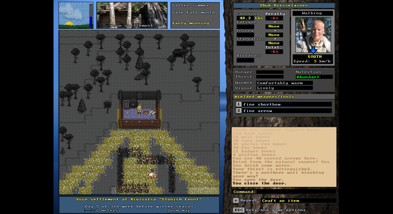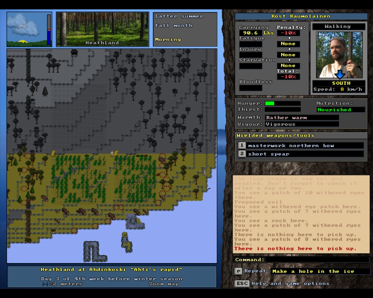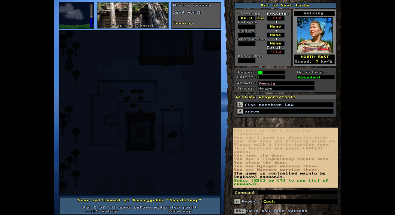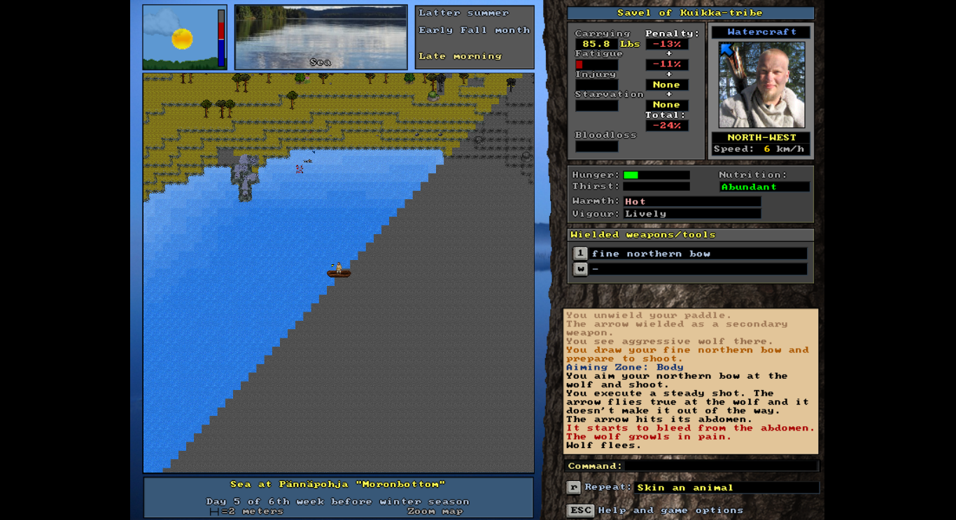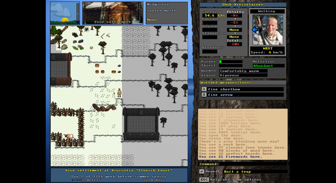 >>37607 Весной наоборот пиздец. То снег валит, то дождь хуярит, лёд слишком толстый чтобы плавать, но тонкий чтобы ходить, прошлогодние ягоды уже сгнили, новые ещё не выросли и т.д. Начинай уж летом, выбирай кумуляйнена и обязательно туториал включи. И сценарий попроще, а не раненым в лесу с голой жопой.