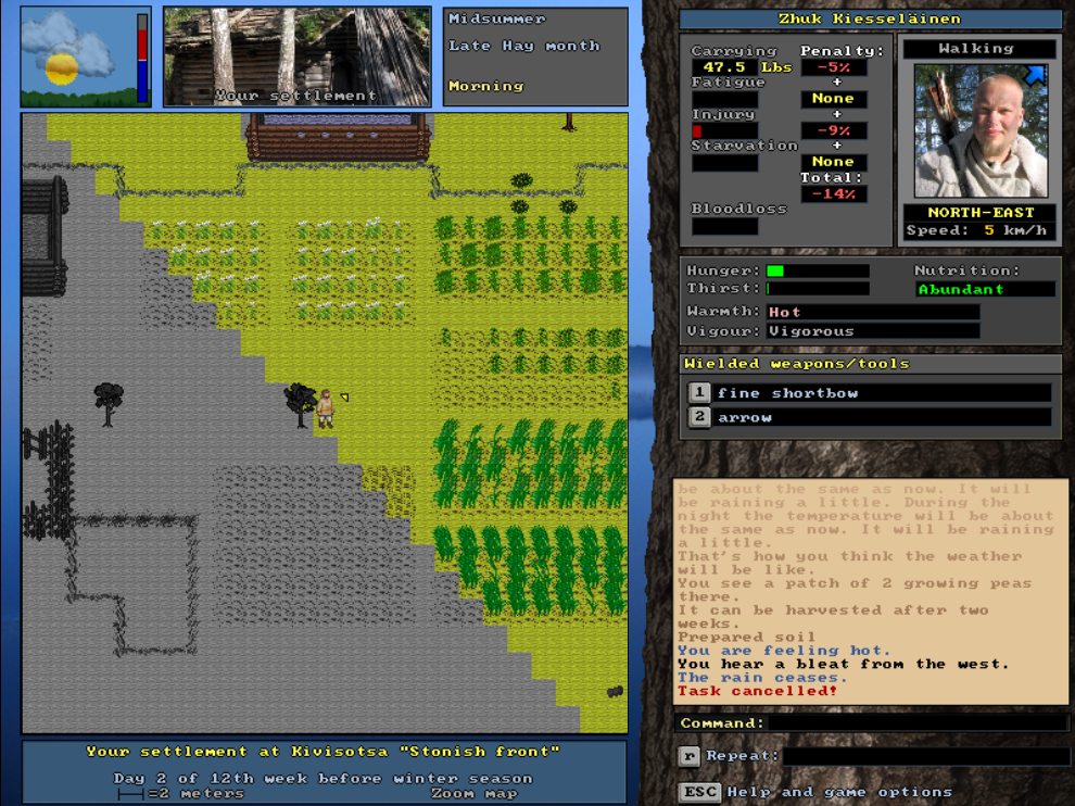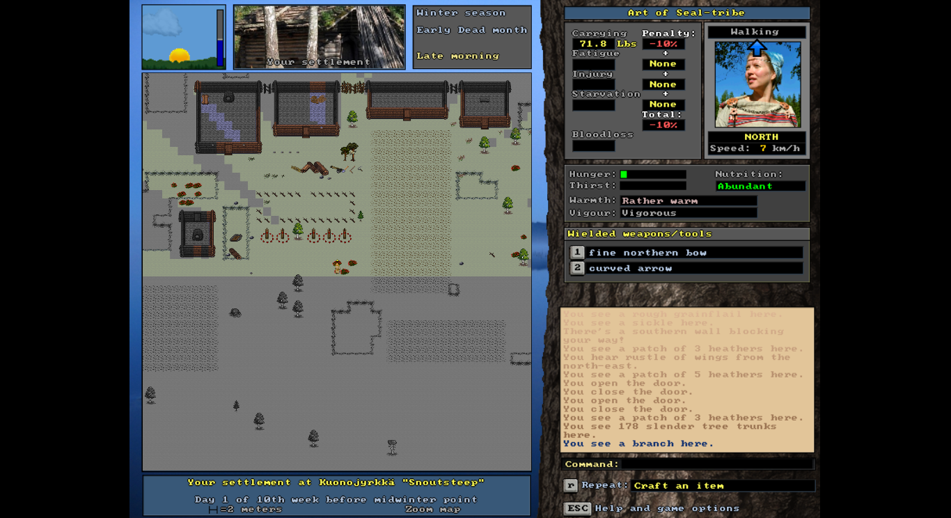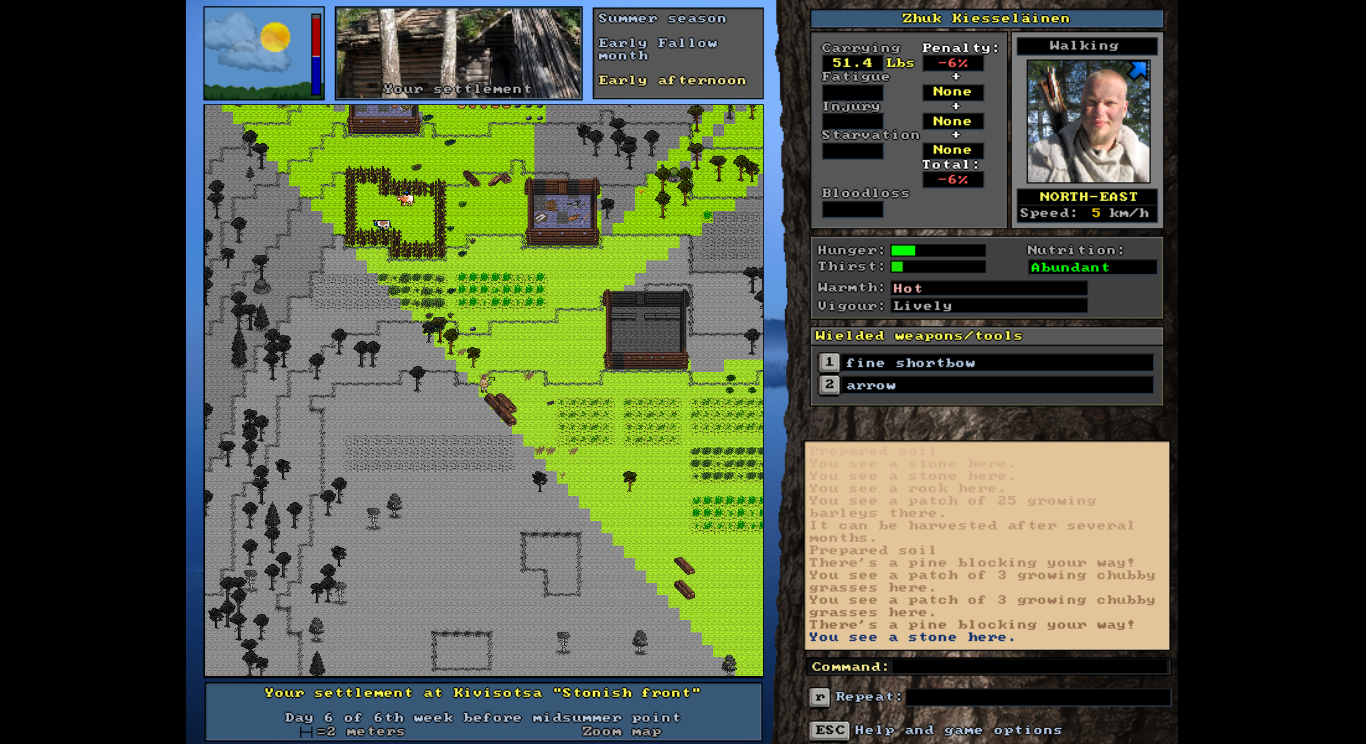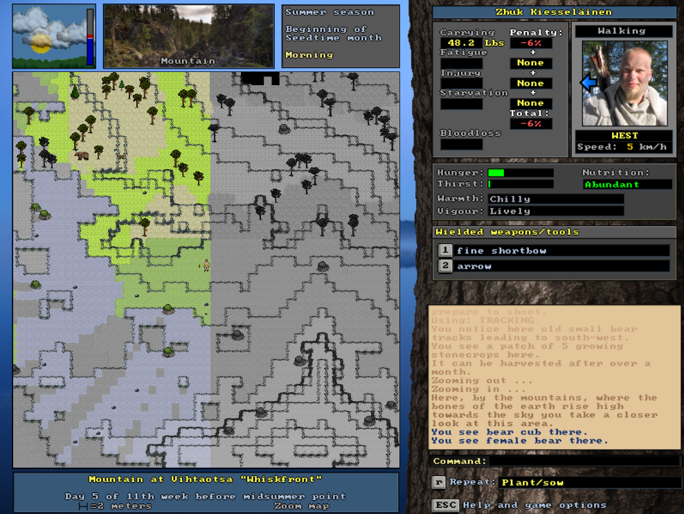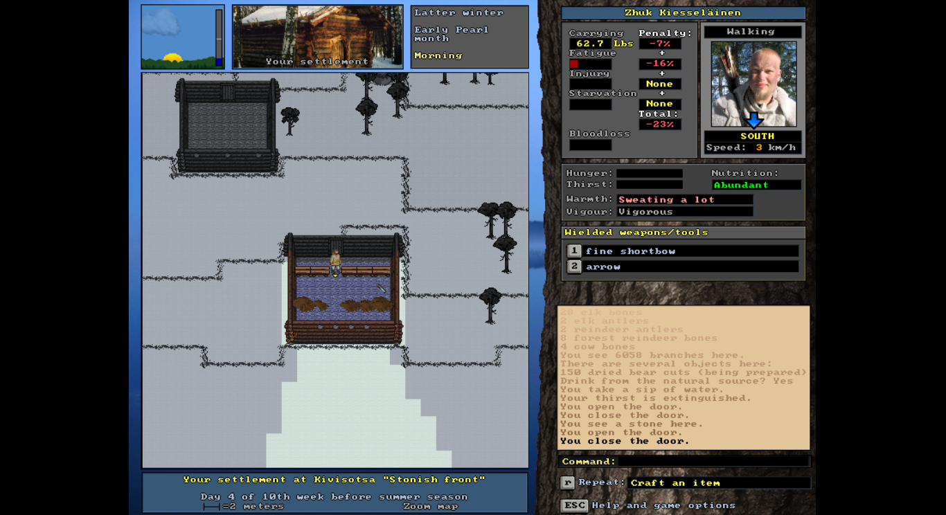 >>37607 Весной наоборот пиздец. То снег валит, то дождь хуярит, лёд слишком толстый чтобы плавать, но тонкий чтобы ходить, прошлогодние ягоды уже сгнили, новые ещё не выросли и т.д. Начинай уж летом, выбирай кумуляйнена и обязательно туториал включи. И сценарий попроще, а не раненым в лесу с голой жопой.
