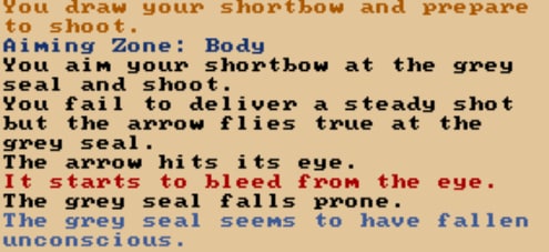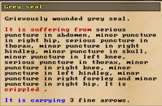 Метóда для рыхлой добычи тюленей выработалась следующая: лодка + лук + 20~ fine стрел + несколько самодельных копий на всякий пожарный = гоняешь беднягу у берега, шугая, не даёшь отплыть в море. Когда заныривает - ждёшь и смотришь в ту сторону в которой он собственно и занырнул (в 9 случаях из 10 он возвращается в поле видимости где-то через минут 40).