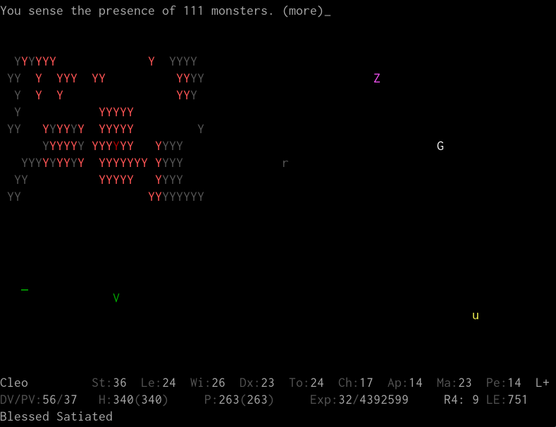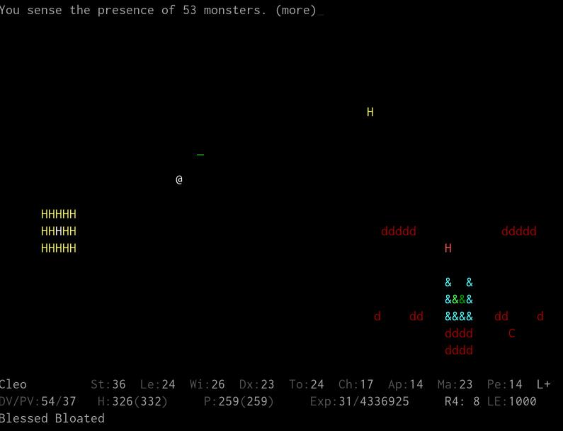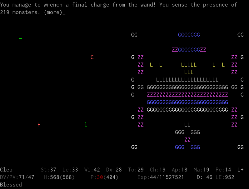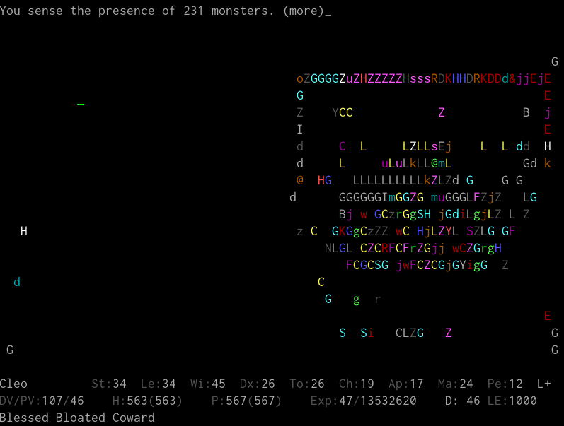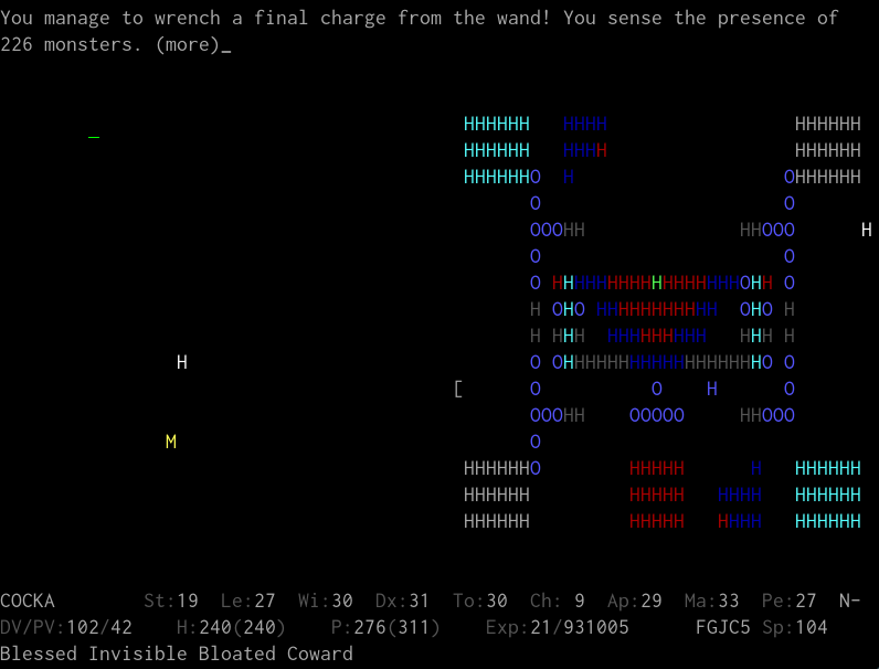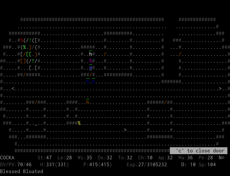 Когда поднимался на поверхность с амулетом кэтлорд внезапно выпрыгнул и бросился в узком коридоре. Хотя до этого всю игру послушно сидел в закрытой комнатке за дверью, пока я спокойно бегал по прокопанному уровню туда-сюда. А я вырезал всех кошек на пути после того как случайно тыкнул в одну и убил. И даже огромную tension комнату львов вырезал. Все зелья буст спида выпил на D:50 (хотя они там особо и не нужны были), короче не убежать от него никак. Думал ваншотнет, но оказалось пробивает в коварде хоть и ощутимо, но не смертельно. Как его убивать тоже был вопрос. Гуманоид слеинга нет, короче начал спамить айс болл и как-то он стал отклеиваться очень быстро, прямо как вшивый балор какой-нибудь. На полхп просто взял и съебал, я не стал догонять. В общем видимо повезло, может быть я всегда его переоценивал.