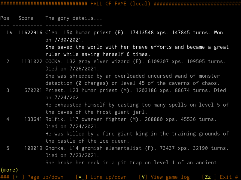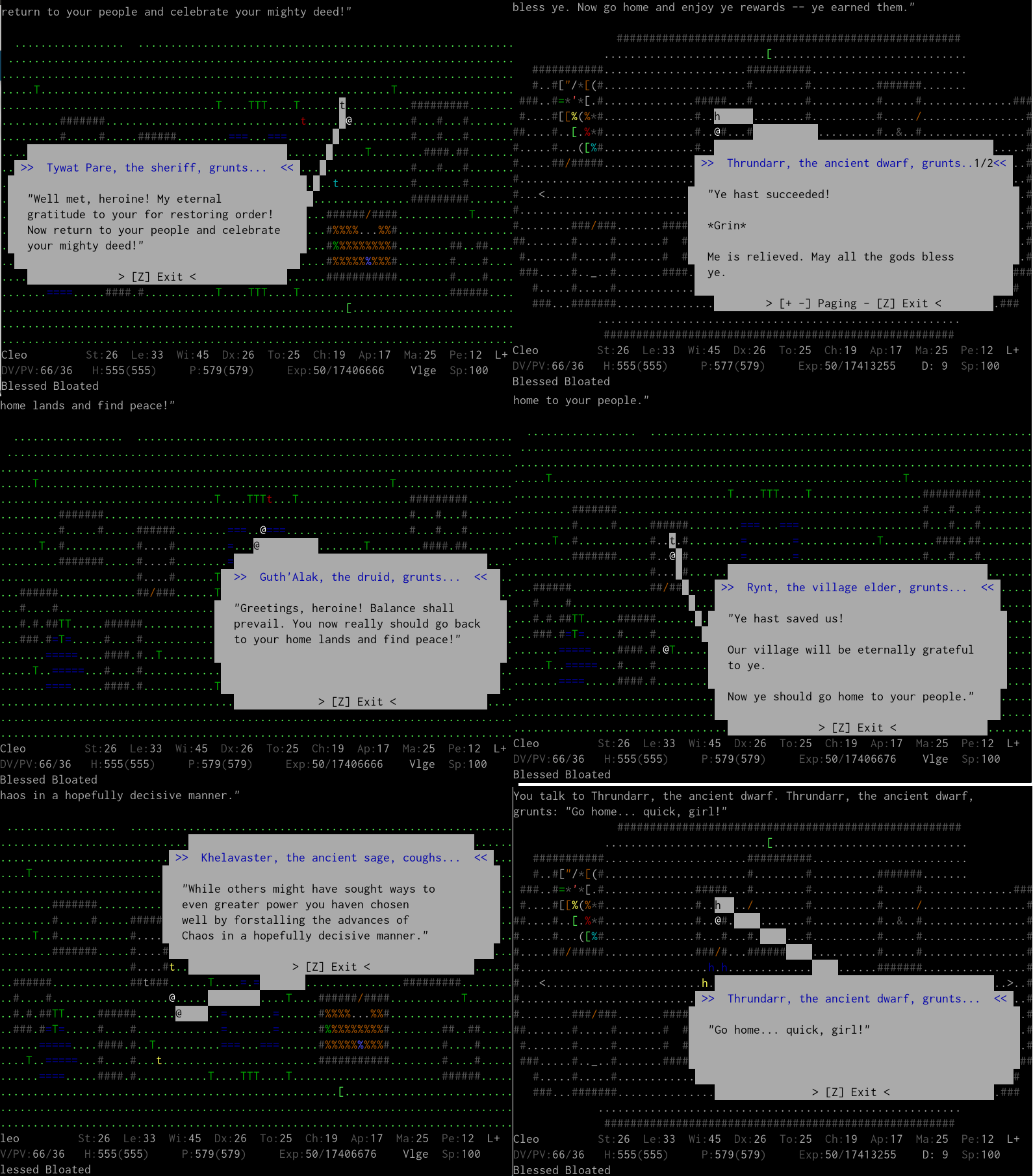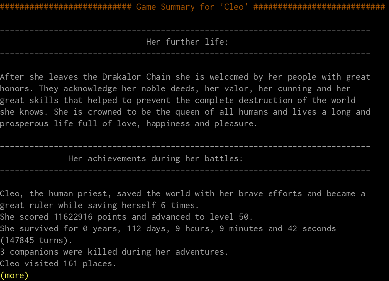 Очень грустно, что персонажка закончила игру, постарев до 70 лет. Начинала-то 25-летней бодрой девкой. Остается только надеяться, что три выпитых зелья longevity и приобретенная сила дадут ей возможность прожить лет эдак до 120 в здравом уме. В рамках партии один раз даже до 100 лет махнула. В таком возрасте заканчивать игру конечно совсем пиздец, пришлось желать зелья молодости. Символично, что она молодой взяла в руки новенький sword of sharpness, а потом он проржавел от желешки и я всю игру пытался вернуть свитками хит/дамроллы до прежнего уровня, как и ее возраст. Но не вышло, ушла из Дракалорской гряды с чем-то типа (-2, 4d8 - 1). Надеюсь потомки будут чтить этот хлам как ценный артефакт и везде форсить, что таким оружием можно даже грейтер молоха разрезать пололам что полный пиздеж, он даже не пробивает его Не стал пытаться нагриндить зелья молодости в бесконечке, а то так состариться рискую уже я. Адом хоть и РПГ, но не настолько, чтобы так упарываться. Коррапты зато почистил целиком и даже остались свитки/зелья лечения на будущее.