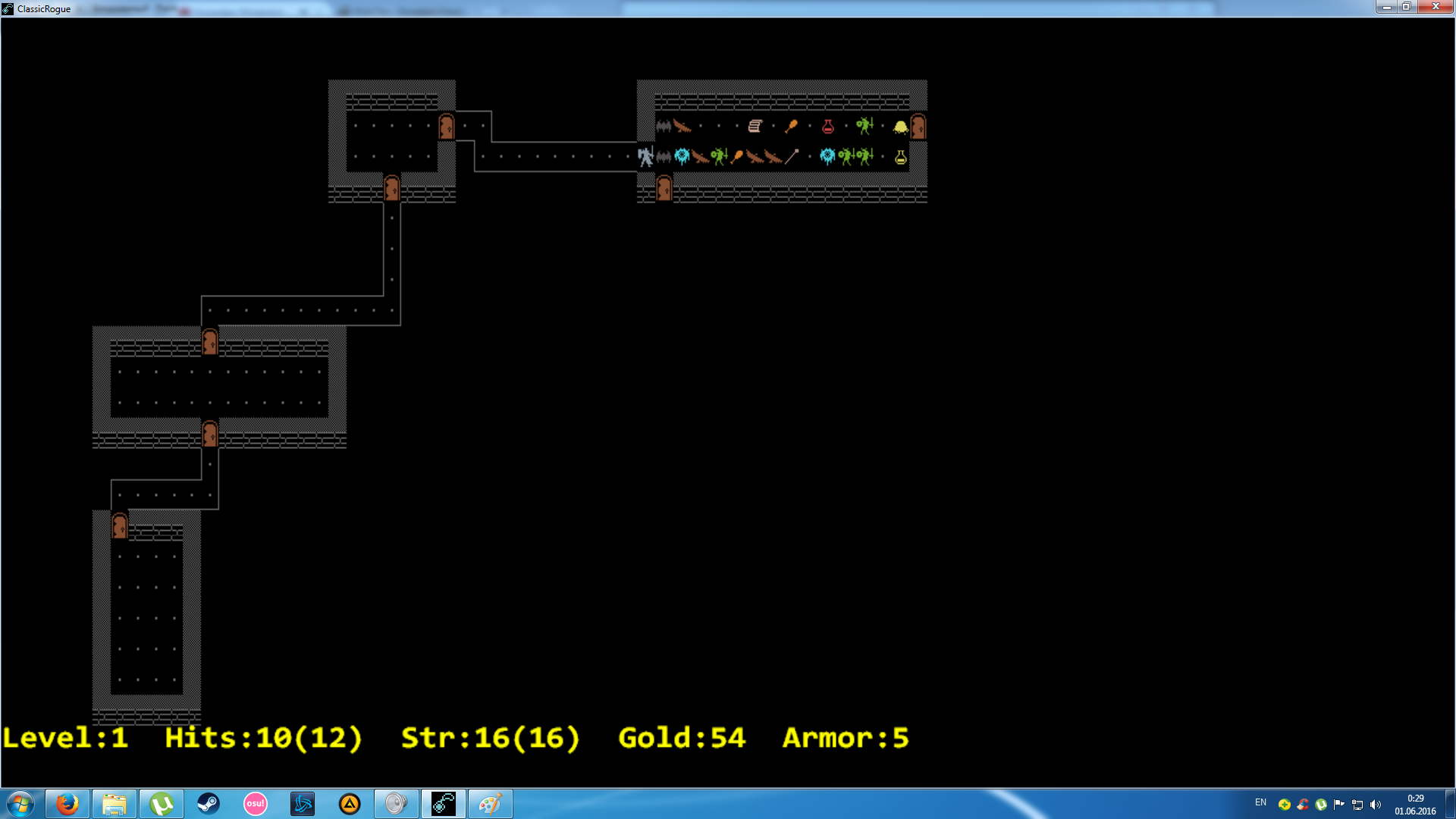 >>8470 Мой был сделан на делфи только не кидайтесь говном! Там был генератор пещер и лабиринтов с комнатами, а так же рандомно бегающие монстры. Это все что там было.