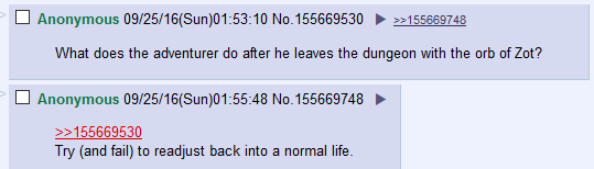 >>4 Рогаликодоска на моём сосаче? О господи, джва года ждал. На /rl dfwk.ru какие-то ебанутые сатанисты с порноспаммерами, на rlgclub.ru слишком уныло. Верю, что здесь будет ламповей и теплей. А в челленджи играет кто-нибудь? Например, в brogue можно выбирать уникальный сид и каждый участник играет по нему, без рестартов и спойлеров, кто больше очков набрал - победитель. На оф. сайте полагались на честность участников, можно и здесь так же, мы ведь не мамкоёбы. Или в другом рогалике можно брать нач. условия, например, класс-расу и тоже пытаться к успеху прийти.