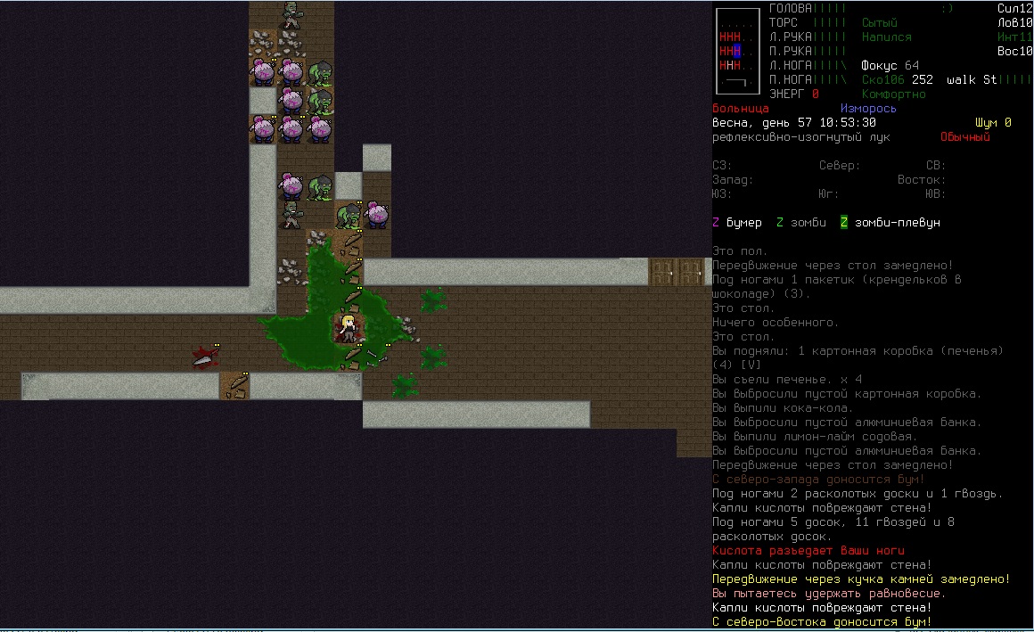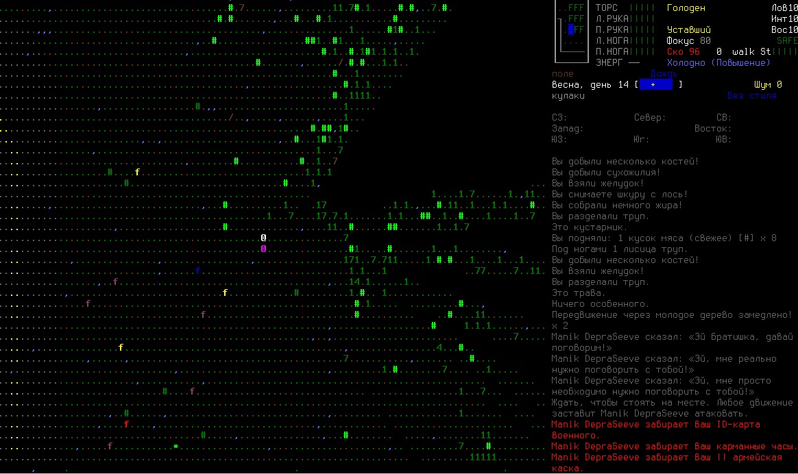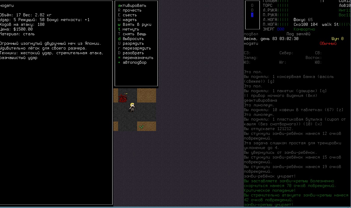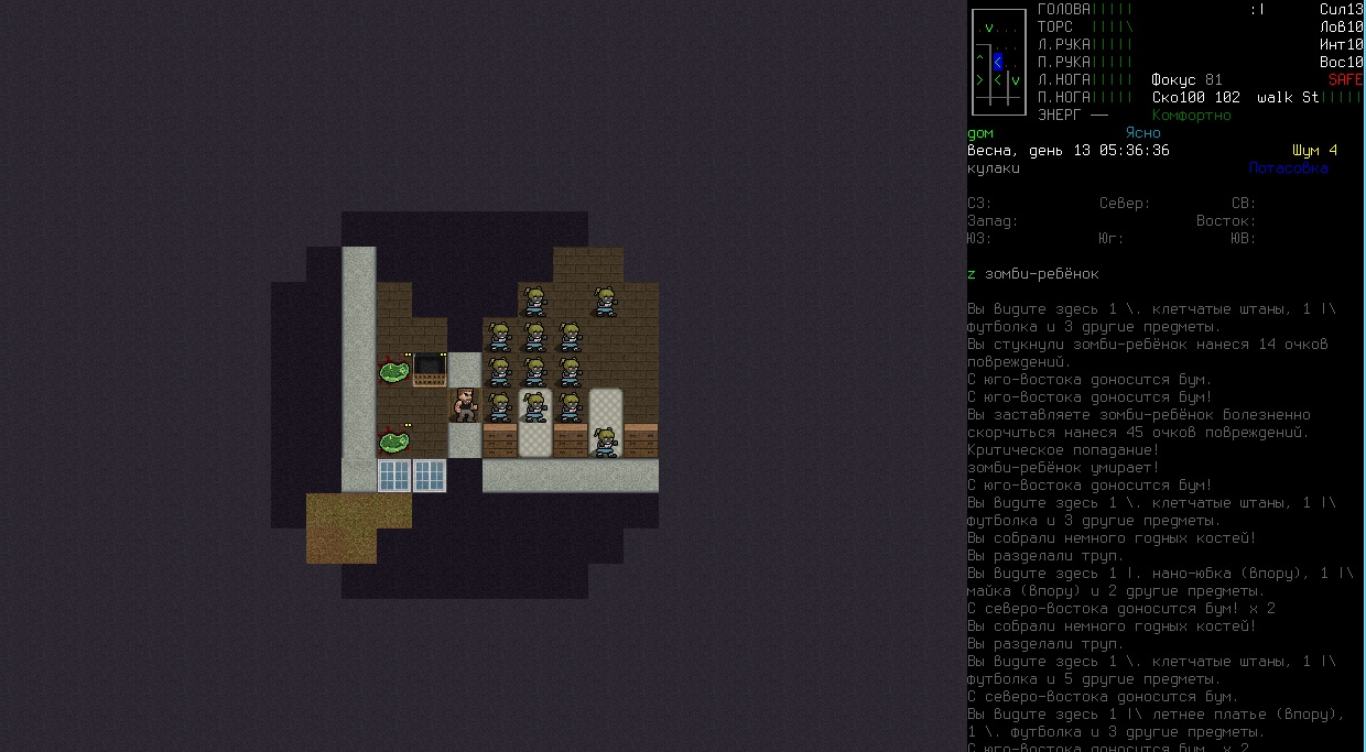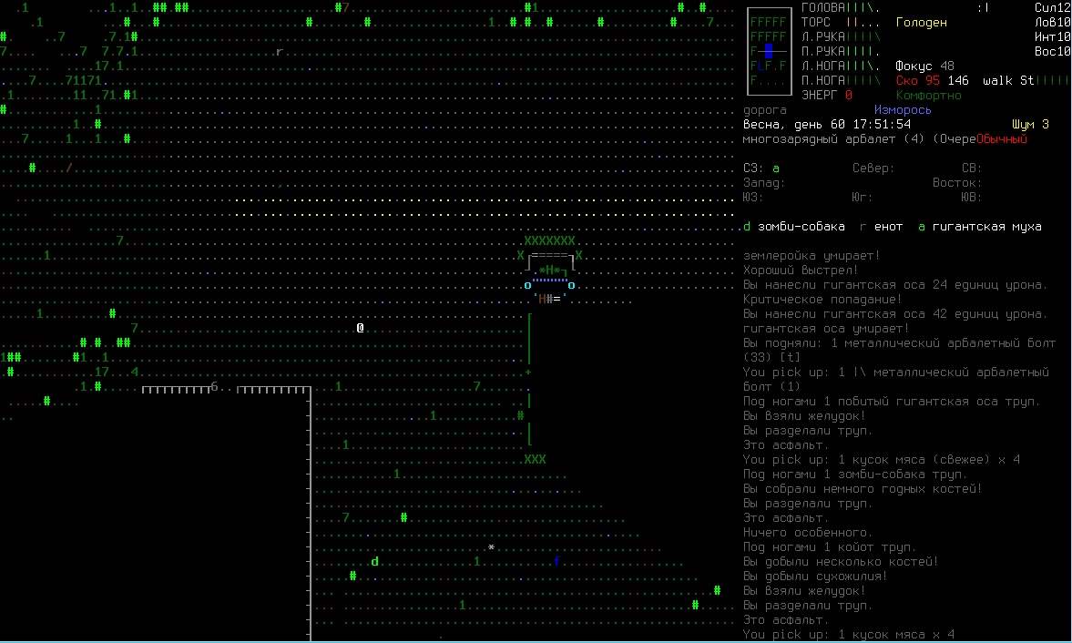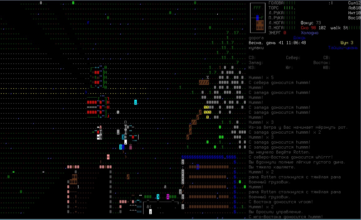 Становимся разумными растениями, убегаем от заражающих спорами грибов, пронзаем зомби рапирой и разрубаем цвайхандером со встроенным огнемётом. Сataclysm dda -- это уникальный рогалик включающий в себя нестандартный сеттинг, широкую систему крафта, строительства и конструирования автомобилей. Окапываемся ямами с точёными пиками в лесном домике, разъезжаем по городам на велике или строим в гараже асфальтоукладчик обшитый лазерными турелями и шипами по периметру. Отыгрываем гопников, бдсм-рабынь, жрём мутантов-младенцев, варим мет в фургончике, прописываем апперкоты псам и убегаем от медведей.