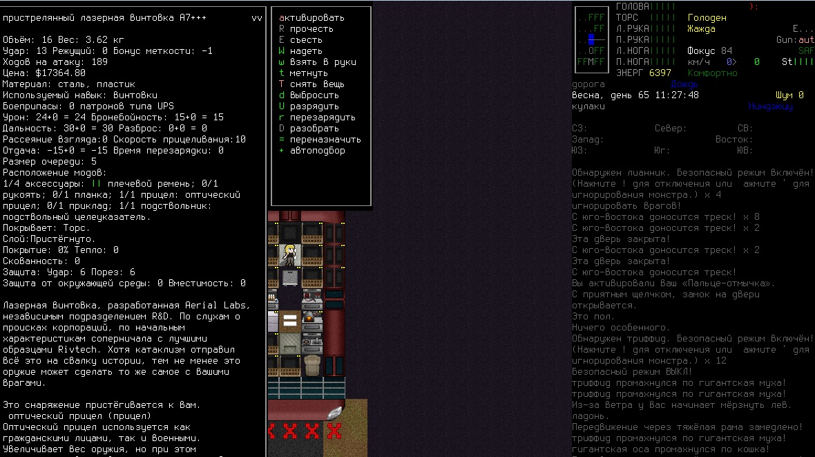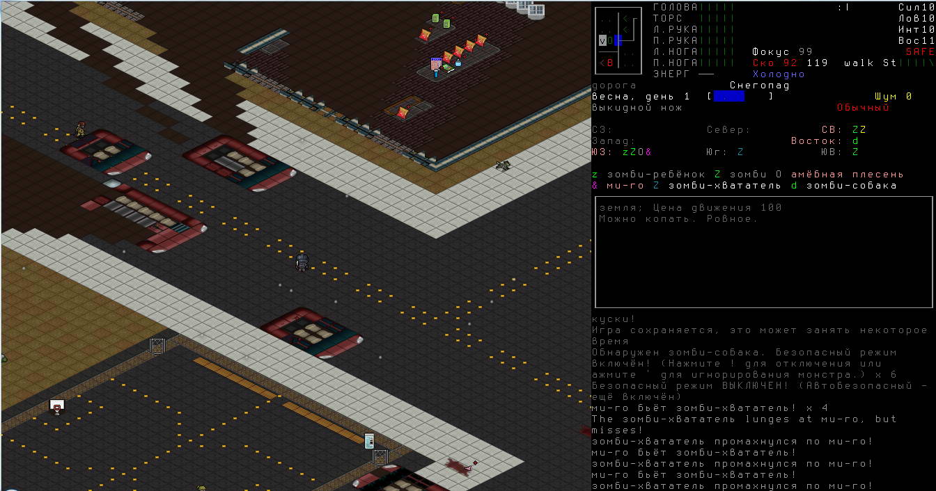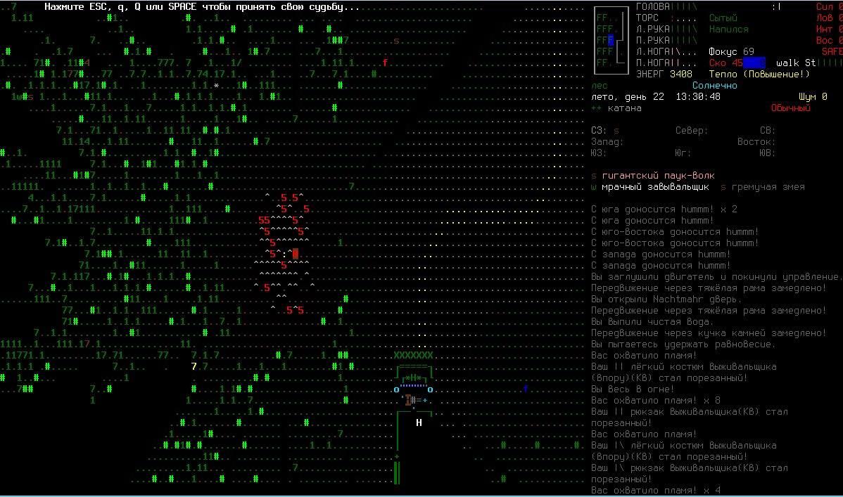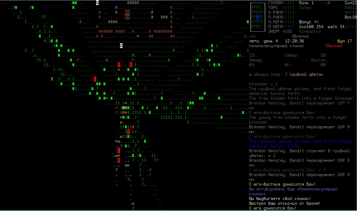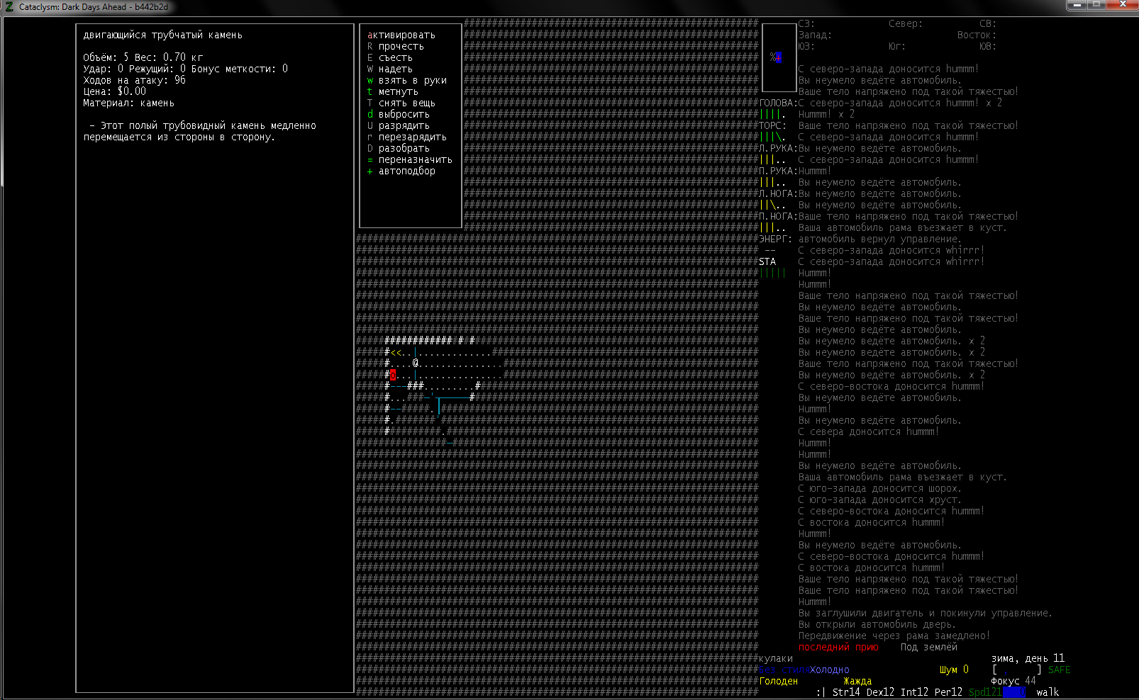 Становимся разумными растениями, убегаем от заражающих спорами грибов, пронзаем зомби рапирой и разрубаем цвайхандером со встроенным огнемётом. Сataclysm dda -- это уникальный рогалик включающий в себя нестандартный сеттинг, широкую систему крафта, строительства и конструирования автомобилей. Окапываемся ямами с точёными пиками в лесном домике, разъезжаем по городам на велике или строим в гараже асфальтоукладчик обшитый лазерными турелями и шипами по периметру. Отыгрываем гопников, бдсм-рабынь, жрём мутантов-младенцев, варим мет в фургончике, прописываем апперкоты псам и убегаем от медведей.