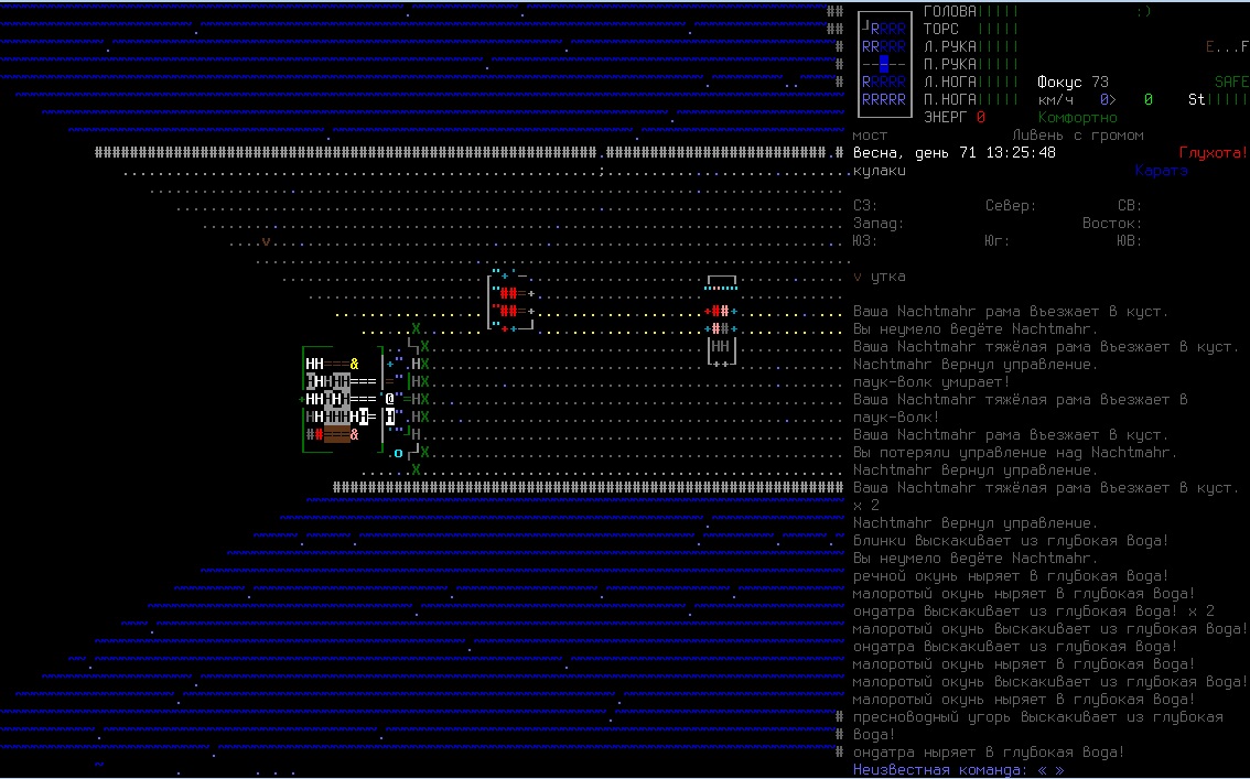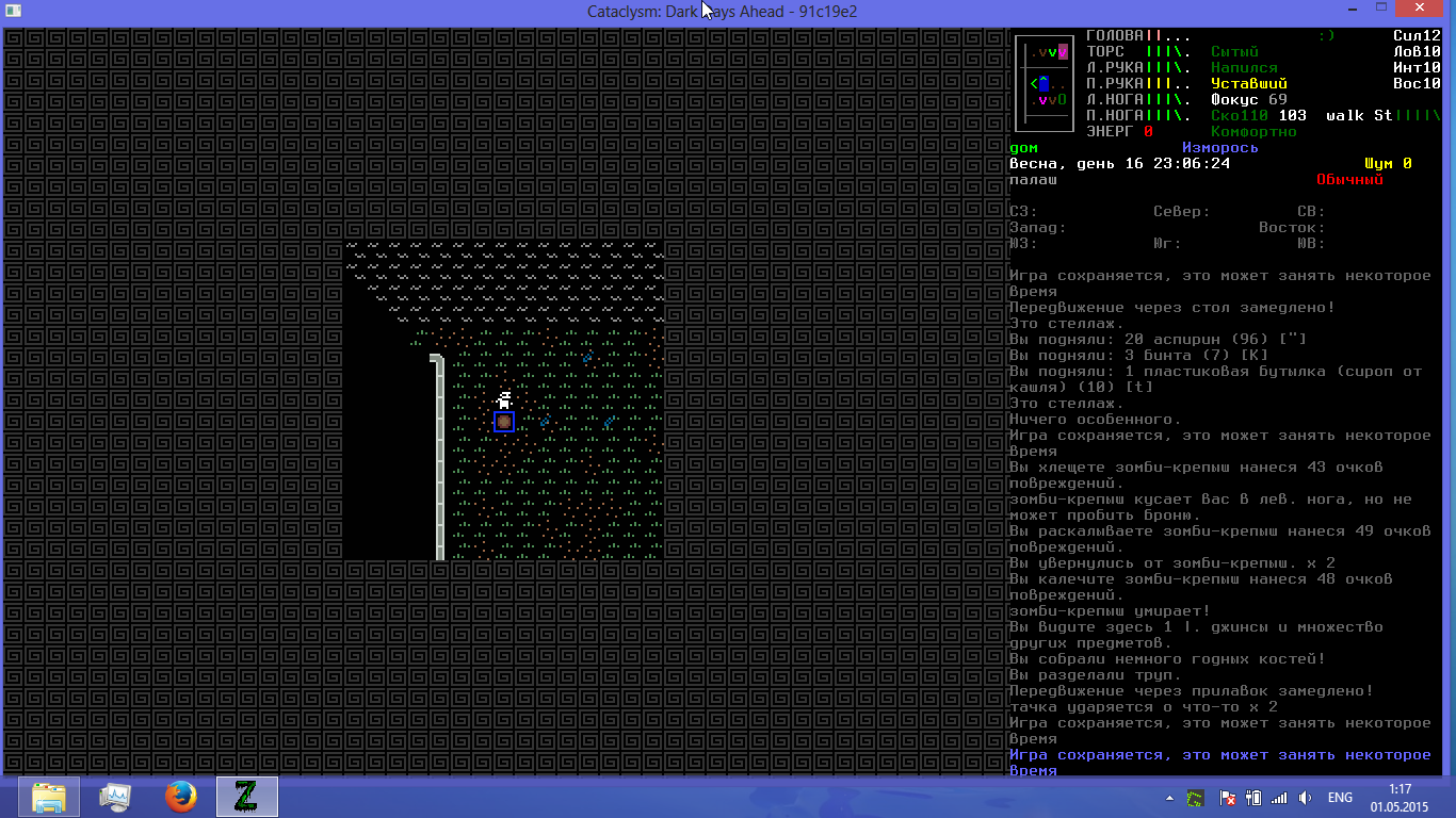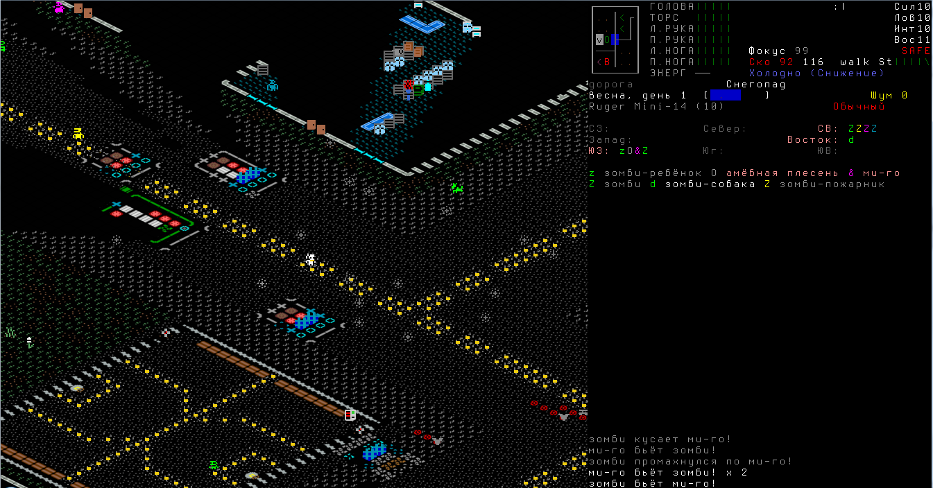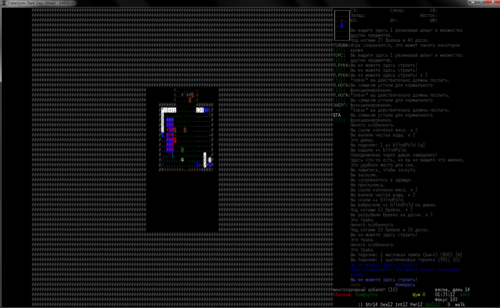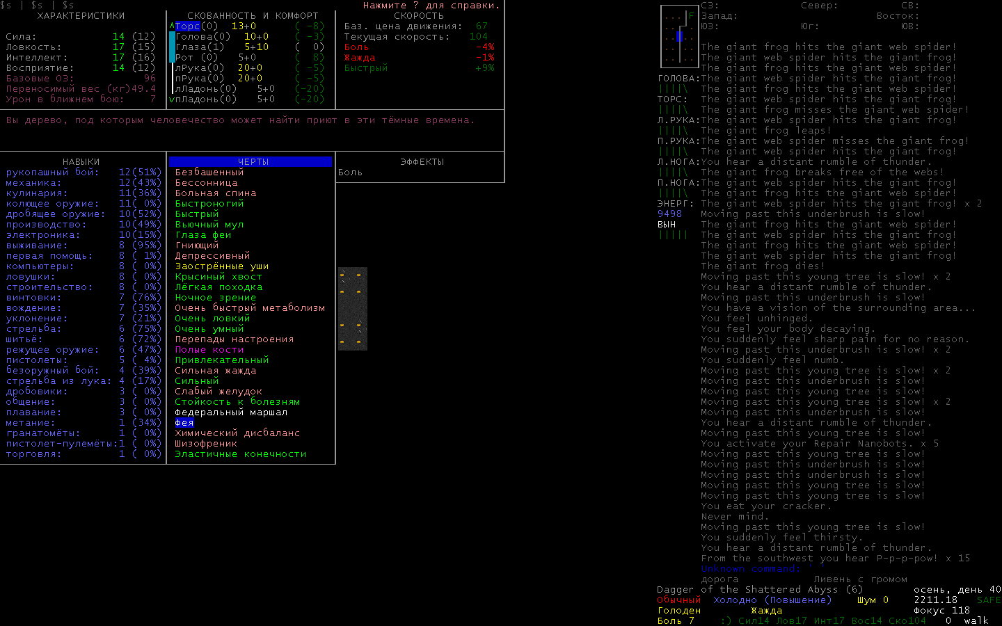 Становимся разумными растениями, убегаем от заражающих спорами грибов, пронзаем зомби рапирой и разрубаем цвайхандером со встроенным огнемётом. Сataclysm dda -- это уникальный рогалик включающий в себя нестандартный сеттинг, широкую систему крафта, строительства и конструирования автомобилей. Окапываемся ямами с точёными пиками в лесном домике, разъезжаем по городам на велике или строим в гараже асфальтоукладчик обшитый лазерными турелями и шипами по периметру. Отыгрываем гопников, бдсм-рабынь, жрём мутантов-младенцев, варим мет в фургончике, прописываем апперкоты псам и убегаем от медведей.