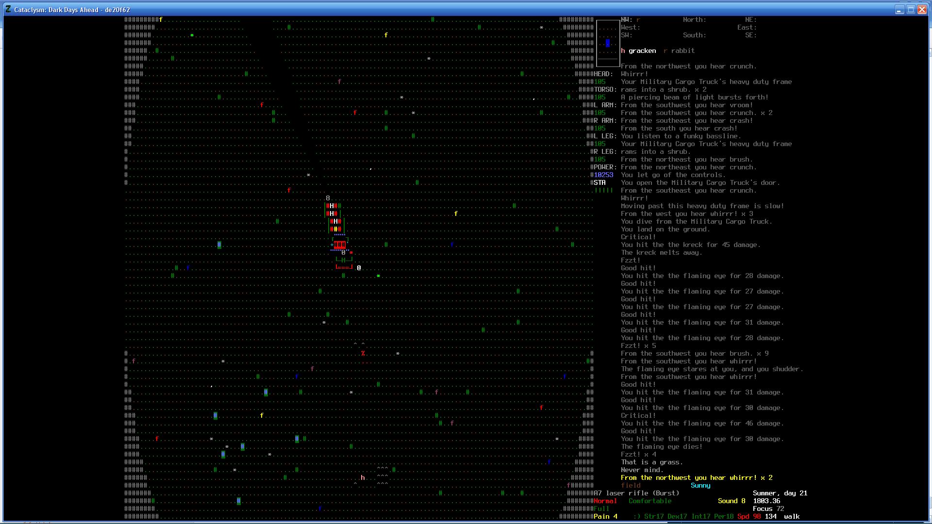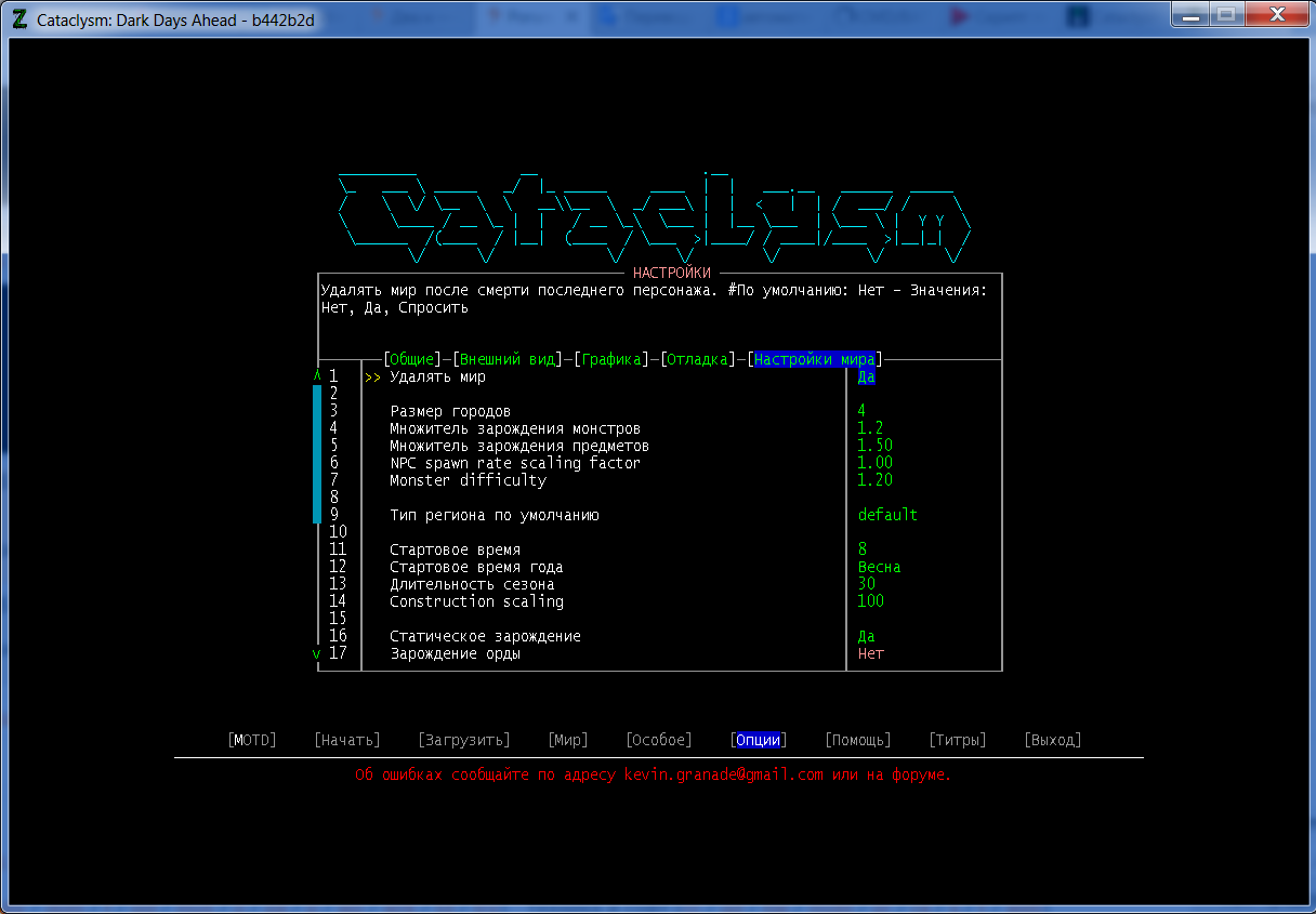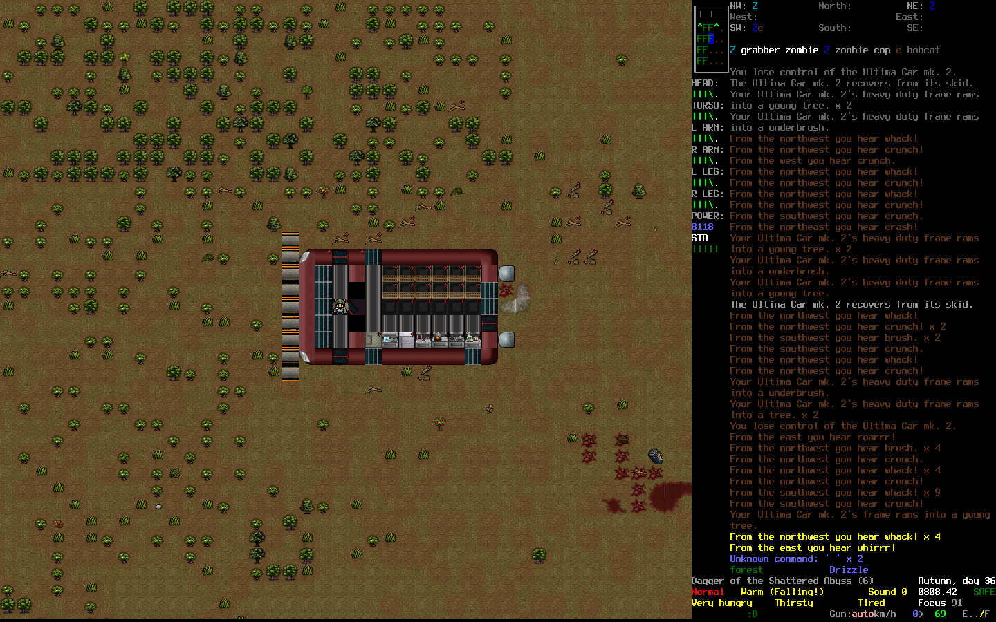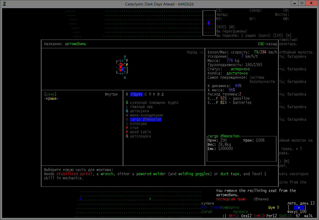 Становимся разумными растениями, убегаем от заражающих спорами грибов, пронзаем зомби рапирой и разрубаем цвайхандером со встроенным огнемётом. Сataclysm dda -- это уникальный рогалик включающий в себя нестандартный сеттинг, широкую систему крафта, строительства и конструирования автомобилей. Окапываемся ямами с точёными пиками в лесном домике, разъезжаем по городам на велике или строим в гараже асфальтоукладчик обшитый лазерными турелями и шипами по периметру. Отыгрываем гопников, бдсм-рабынь, жрём мутантов-младенцев, варим мет в фургончике, прописываем апперкоты псам и убегаем от медведей.