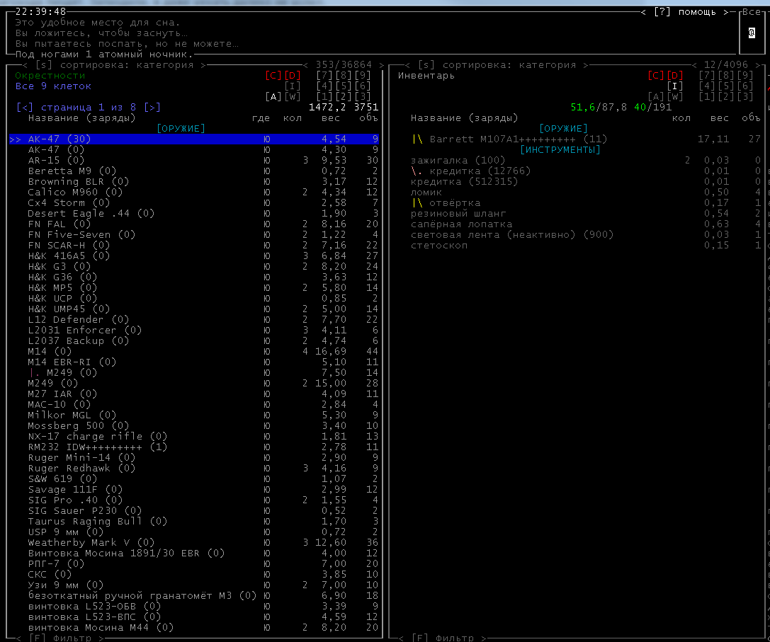 Ппц, сранные мосты забитые тачками. Не проехать, разбирать долго, взрывать жалко (взрывчатки). Каждым мост заставлен. Буду делать самокат для разведки. Что-то целый день сериалы смотрел валяясь на диване а тут решил в катаклизм поиграть и опять затянуло что-то, город почистил, получил православных тумаков от амбала и какая-то шлюха ворвалась за мной в спорт магазин с USP 9мм, пиздец, с ходу стала палить, осталось тупо на один выстрел хп да так вышло что кританул её, чуть не слился. На грохот выстрелов набежала зомбота благо успел аптечку заюзать. Еще в шахту попал но там амигары, развернулся назад, вытащил пару КБМ и канистру, хоть что-то. Теперь упорюсь книгами по кулинарке, хочу мутировать в кого-нибудь, пока не решил да и описания на вики не хочу смотреть из-за спойлеров но в то же время и зашкваривать свою Кристи не хочу.