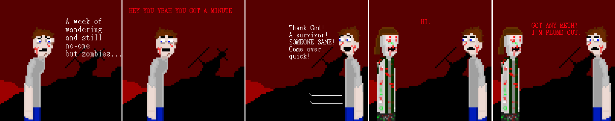 Набег на торговый центр кончился тем что в проходе толпа зомботы смела стену и разъебала мою тележку с набраным добром, давно я такую озверевшую кучу не видел. Начали щемить в угол, кое как справился правда весь покусанный был. Выбрался на улицу ломом разбив стеклянную дверь, отоспался в тачке не по далеку. Пойду теперь обратно с новым багажником и лопатой, откапывать свой лут.