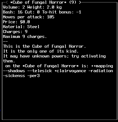 >>5543 http://www.wiki.cataclysmdda.com/index.php?title=Artifacts >"Natural artifacts" that can be found in anomalies are less random and come with only two fixed effects, which are always good one and bad one. Both effects can be active or passive, or only good active with bad passive. Also natural artifacts are always tools and can be recharged. >whispering >+clairvoyance, extinguish, stealth >-evil, schizo, attention