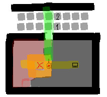 Палю годноту по борьбе с турелями в лабах. Стоя в позиции 1 открываем дверь и отходим на позицию два. Розовое - наше поле зрения на позиции два, зелёное - то что видит турель. То есть ни мы её, ни она нас не видим, кидаем взрывчатку на красный крест, оранжевое - радиус взрыва. Самый лучший выбор - самодельная бомба из трубы (разбираем шкаф или прилавок), короткой верёвки (разбираем ремень безопасности машины до этого состояния, получится оче много) и сравнительно небольшого количества бензина (кажется это 0,2% обычного бензобака). Делаем пяток таких херовин на случай если нам будет НУЖНО пройти через комнату с турелью.
