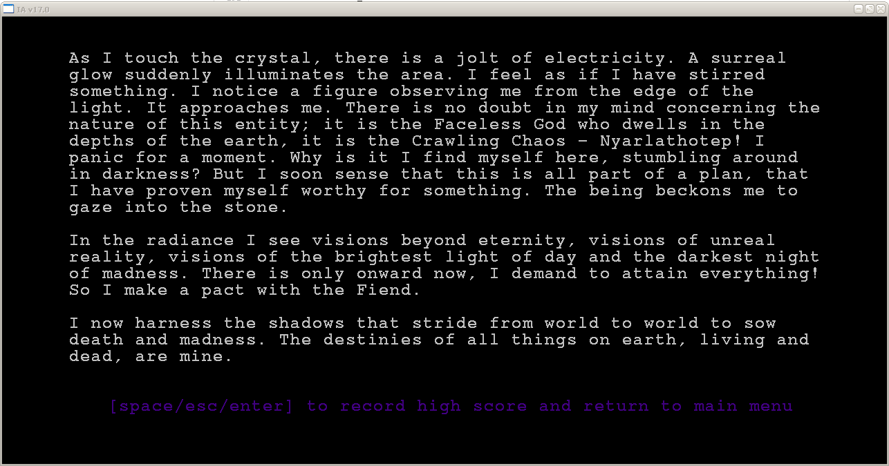 Плюсы игры: - страшная атмосфера. Один из немногих действительно пугающих рогаликов; - разнообразие оружия, зелей и манускриптов; - показатель страха и безумия - персонаж может натурально испугаться монстра до усрачки или вообще сойти с ума; - все стандартные рогаликовые плюшки - пермасмерть, рандомная генерация уровней и так далее; - не то чтобы большой размер - за несколько часов можно пройти до конца при общей умеренной сложности игры;