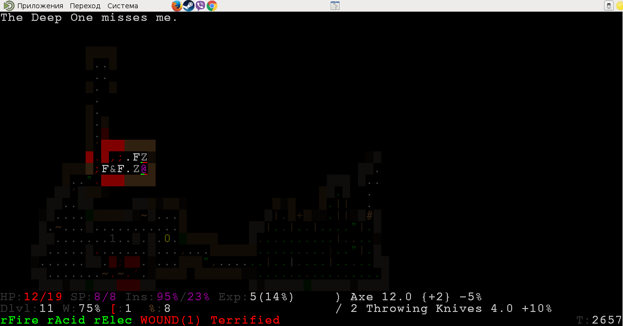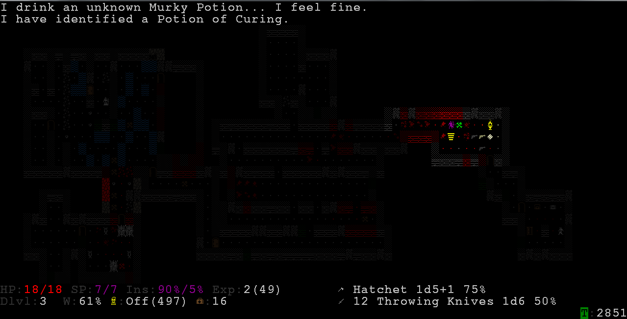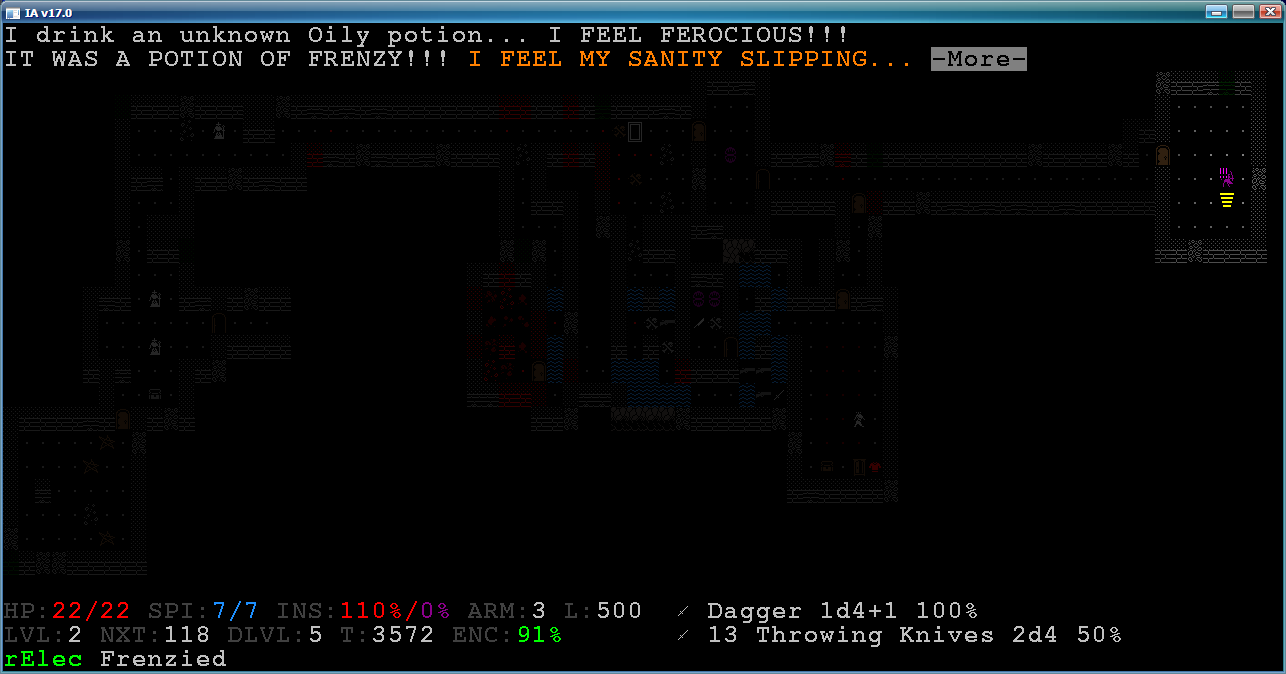 >>3403 Я рогой пользовался только дагером, из-за его бонуса к бэкстебу, и хз, насколько топорик будет практичнее. В след раз если найду и то и то то возьму в разные руки и опробую. Алсо из советов - в слоте метания порой полезно держать зелья слепоты, конфусион или парализа. Например в случае встречи с салемской ведьмой, если она тебя спалила, то попав в неё сабжем можно обезвредить. Или удирая от толпы гулей по узкому переходу, ослепив ближайшего, можно спокойно удирать, т к он блокирует собой проход. Иногда против толп мобов полезно юзать свиток призыва - может призваться очень серьёзная нех, вроде полипа, которая без твоей помощи перебьёт всех. Кстати свойства вредного зелья можно узнать, кинув в моба и попав - если это допустим яд, то тебе это напишет.