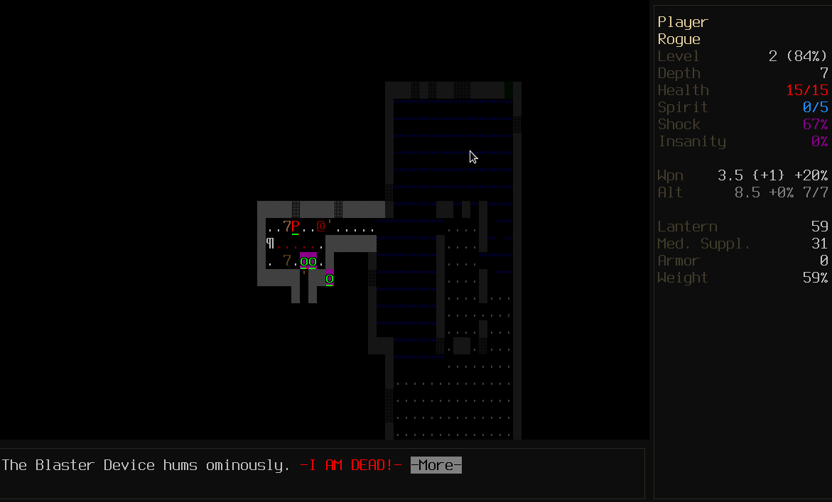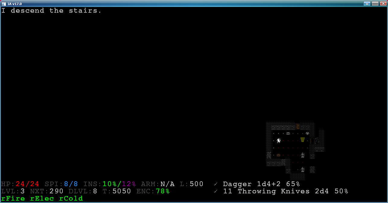 получилось без особых проблем дотащить rogue до 27 этажа. Потом фонарик сдох, по дебильному нарвался на стадо обезьян, они меня и порвали. Ни разу за все 27 этажей фонарь не попался, пиздец же