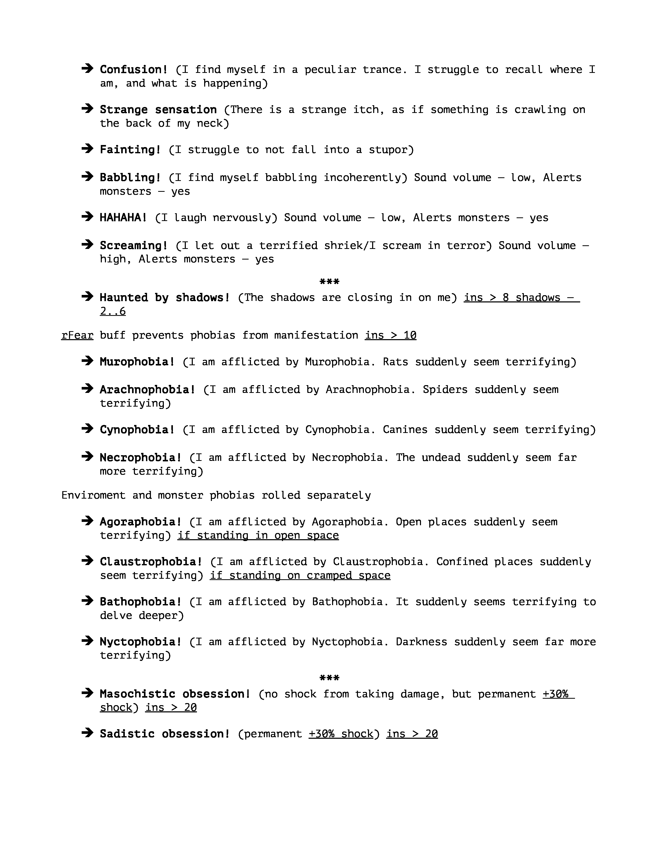 >>3889 > Когда страх доходит до 100%. Фобия генерируется точно не скажу, но вроде как в зависимости от ситуации. нашла паника в темноте - фобия темноты. Фобия может выпасть если безумие превышает 10%. Это один из возможных вариантов развития событий при увеличении безумия. У фобии 11% шанс выпасть. От места зависит только одна вроде как.