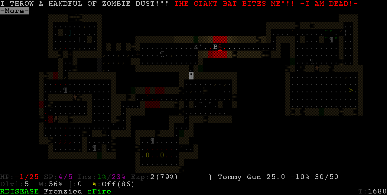 >>19488 Я бы так не сказал что читерный, почему то я постоянно бегаю избитый а иногда на грани смерти, здоровье не восстанавливается, а жрать трупы за 1 ход это конечно бредово.