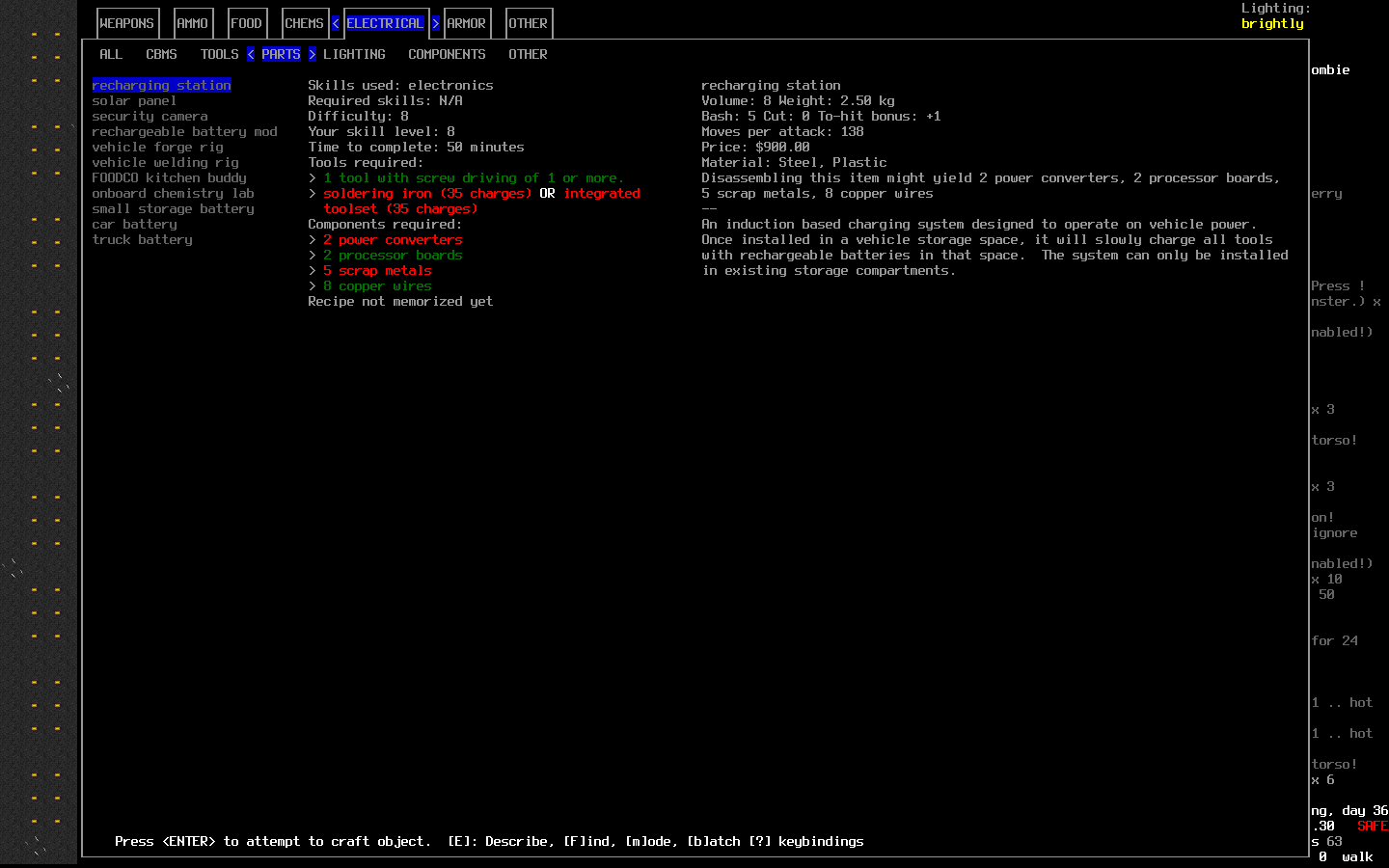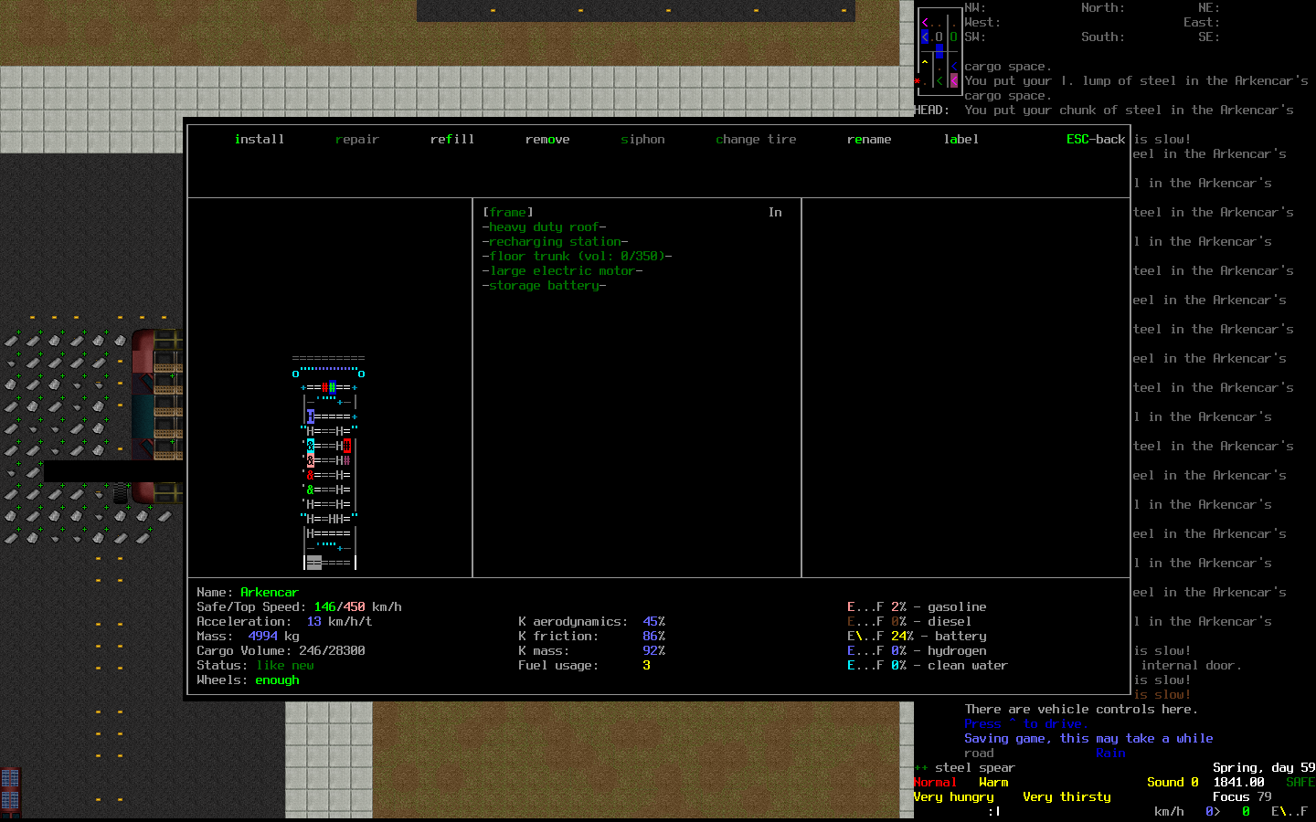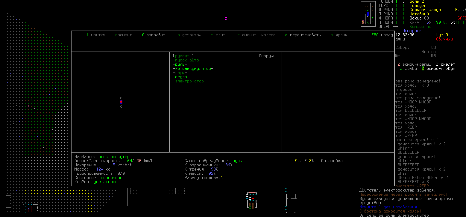 >>8937 1. Полтреда без этого говна играет, ненужный костыль. 2. Измени размер шрифта/тайлов или нажми z >>8938 Батарейками. Чтобы завести хватит и сотки - наелись на аккумуляторами и нажми f , он вбухает в аккумулятор ВСЕ батарейки из инвентаря, так что выложи те, которыми не готов пожертвовать. После этого аккумулятор заряжается от работающего двигателя, если есть генератор. Можно поставить солнечные панели, они пассивно заряжают аккумуляторы при ясной и солнечной погодах. И да - если аккумулятор/бензобак ниже желтого, то они "протекают" и смысла их заправлять не починив нет.