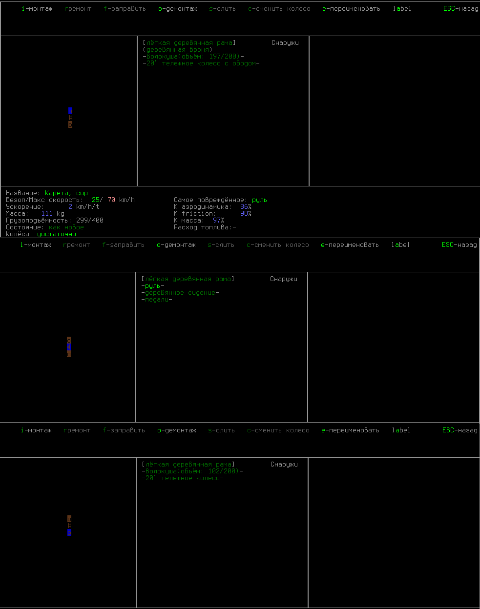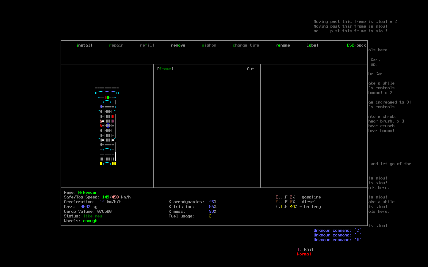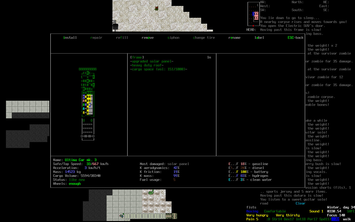 >>8937 1. Полтреда без этого говна играет, ненужный костыль. 2. Измени размер шрифта/тайлов или нажми z >>8938 Батарейками. Чтобы завести хватит и сотки - наелись на аккумуляторами и нажми f , он вбухает в аккумулятор ВСЕ батарейки из инвентаря, так что выложи те, которыми не готов пожертвовать. После этого аккумулятор заряжается от работающего двигателя, если есть генератор. Можно поставить солнечные панели, они пассивно заряжают аккумуляторы при ясной и солнечной погодах. И да - если аккумулятор/бензобак ниже желтого, то они "протекают" и смысла их заправлять не починив нет.