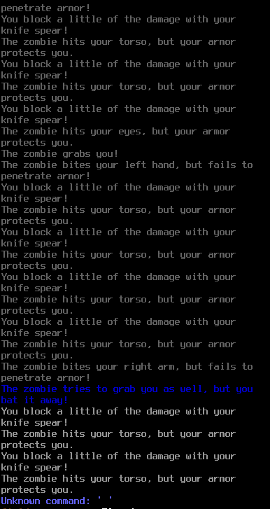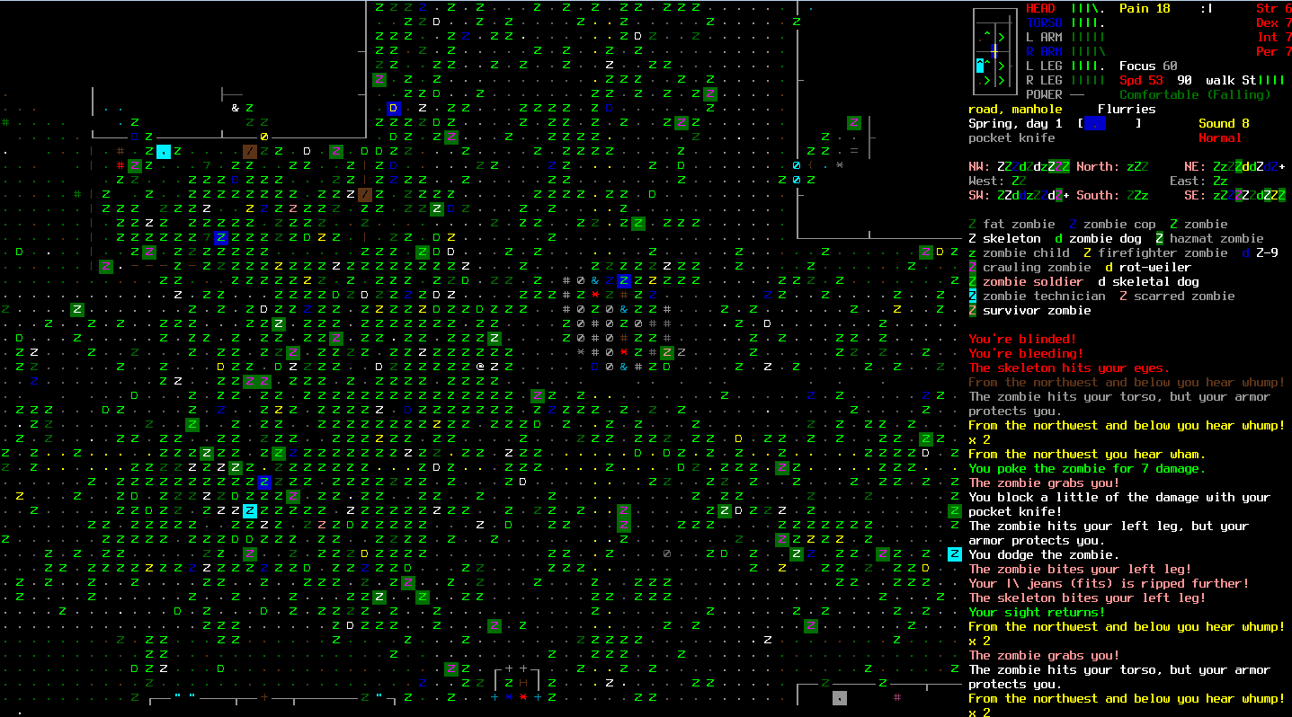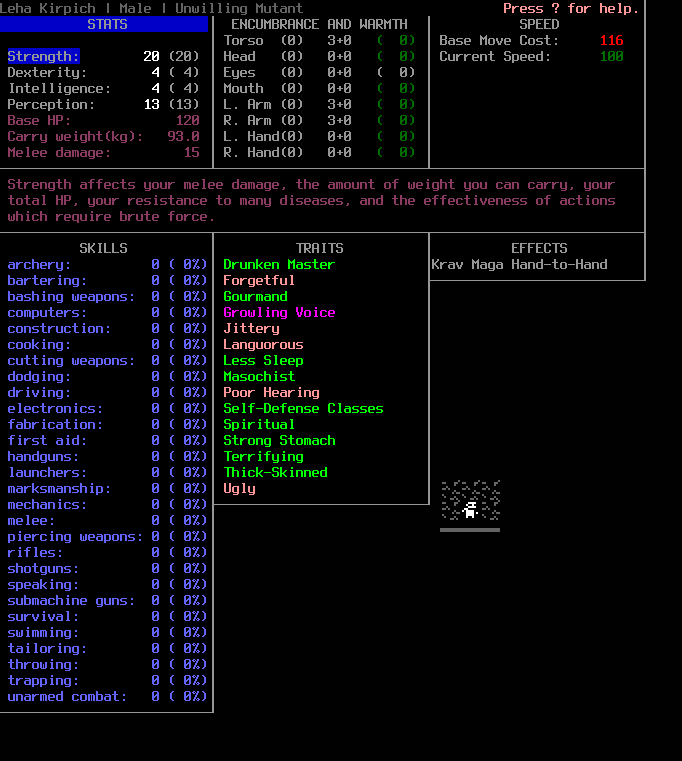 Мой первый ватник кончил плохо - на 5 уровне лабы он наткнулся на ферал предатора и, успешно уворачиваясь в течение 15 ходов (с 4 dex, сниженными от боли до 2), истёк кровью. Почему же в начале игры он наткнулся на предатора? Всё очень просто - пикрелейтед. Я поставил начало игры зимой и сезон в 90 дней, и игра решила, что это 270 день игры. Ну, типа, у нас же прибит гвоздями старт весной. Поэтому чтоб стартовать зимой, нам нужно промотать годик. Это же очевидно.