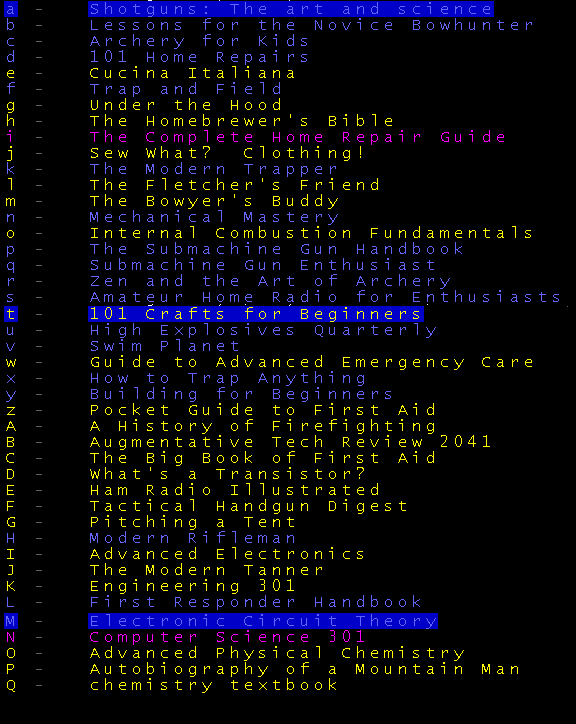 >>10774 >>10775 В библиотеке можно книги найти, а если зомбей бить желания нет, то можно побежать в лес качать выживание на кустах.
