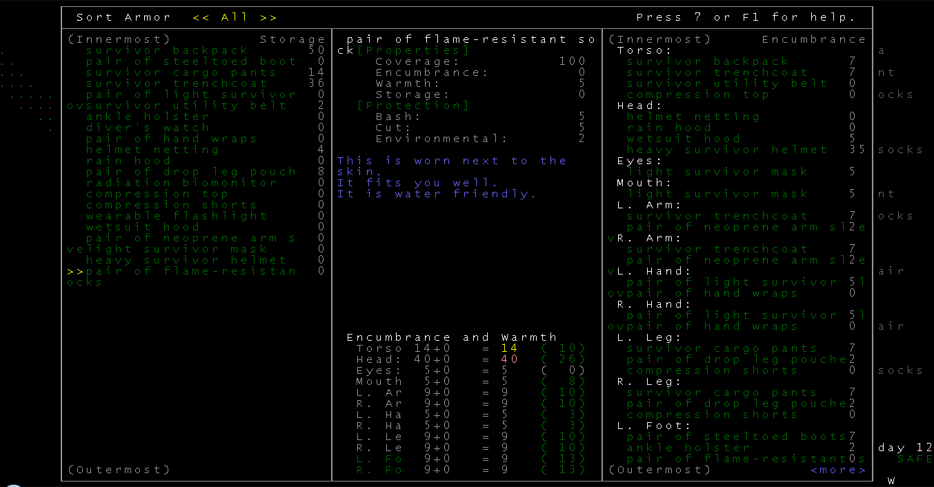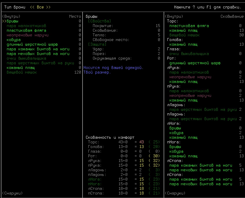 >>10489 Пиздос. Вобщем есть 4 слоя брони, на каждой шмотке написано в какой она слой идёт. Если там добавлено что она удобная и не затрудняет движений (layers easily) она считается за 0.5 шмотки. Ну так вот, ты можешь иметь по одной или 1.5 вещи (обычная+не затрудняющая) в каждом слою не получая encumberment. У тебя вероятнее всего надеты вещи из одного слоя.