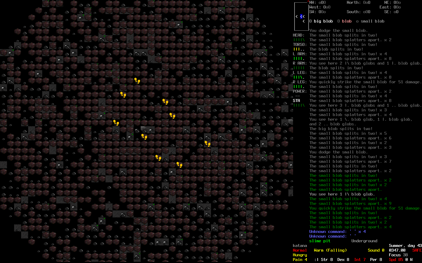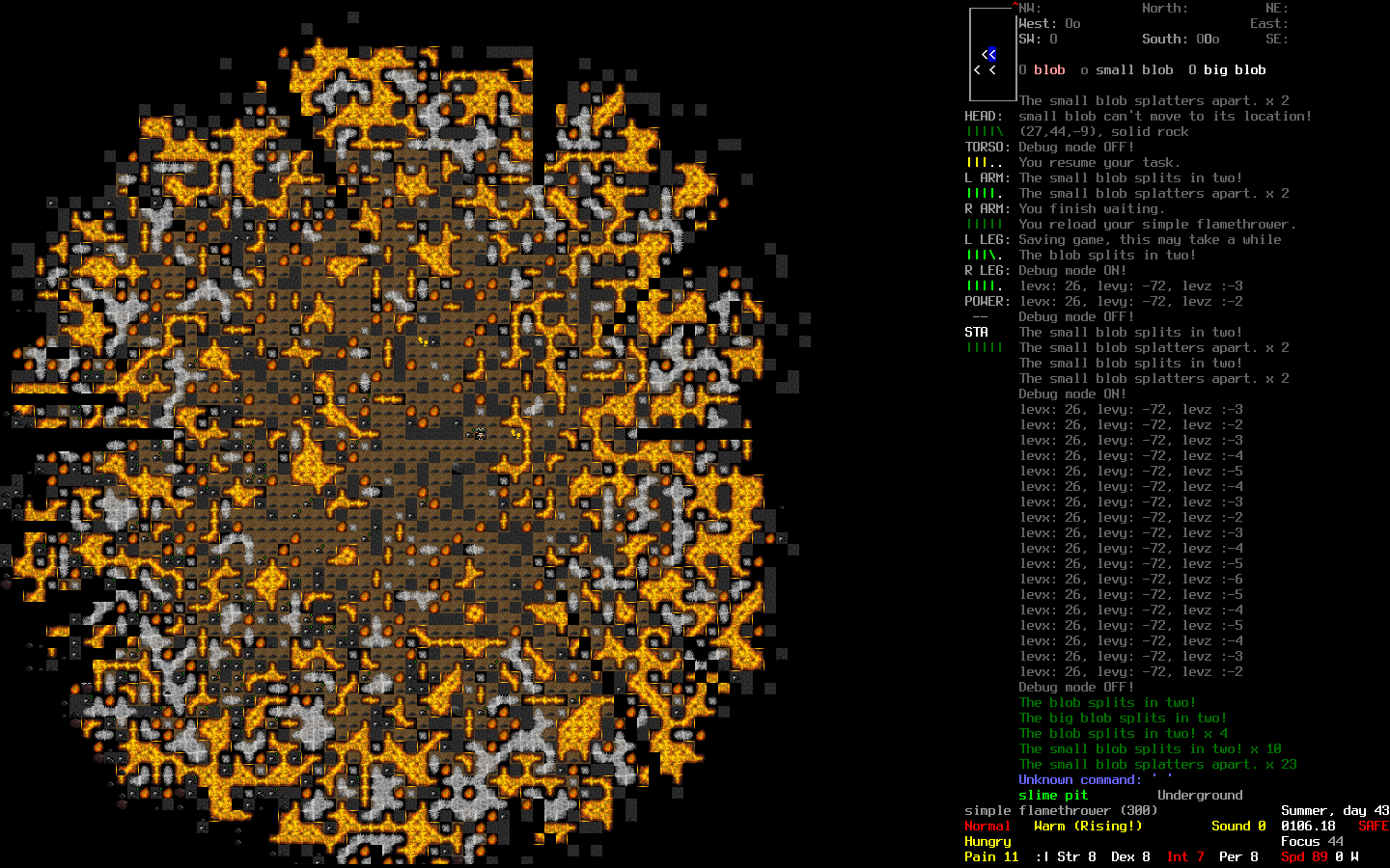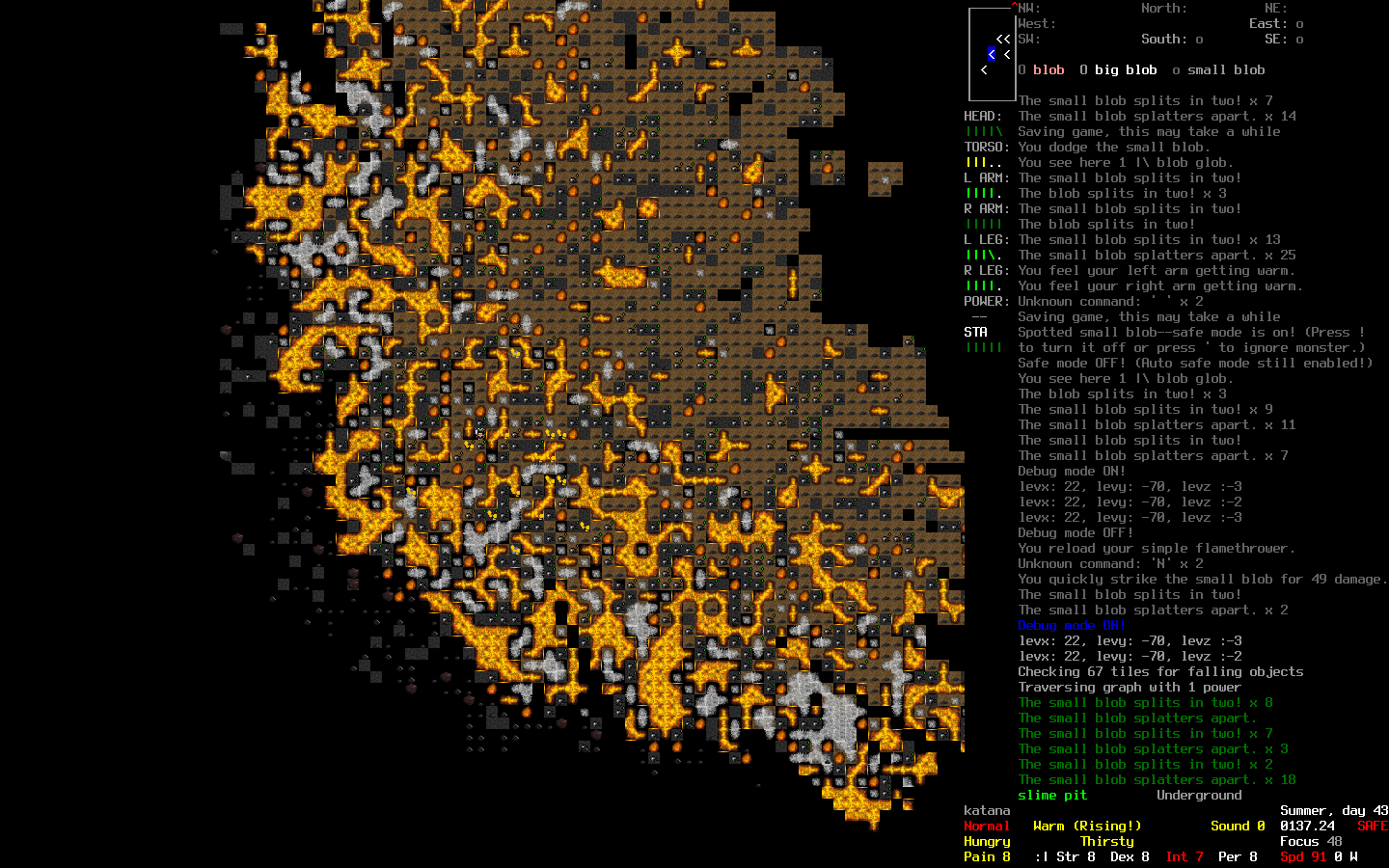 >>10690 Проснулся, вкатился, вот что расскажу. Понял я однажды, что мне нужна слизь, много глобов, ОЧЕ МНОГО ГЛОБОВ. Нахожу ближайшую яму, беру огнемёт с фузионкой, вкатываюсь. Иду, вижу, блобы мелкие по земле ползают, бью фузионкой, вроде дохнут, но потом из ниоткуда снова появляются. Какого хуя, думаю, надо всю яму вычистить, если я тут что-то хочу сделать. Подхожу ко входу, вижу, как королева триффидов тоже слизь разносит. И паук где-то рядом их всех покусывает. Ну значит, фузионкой стреляю, чтобы двух зайцев убить, смотрю на пожар, спускаюсь. Начинаю пилить яму катаной, понимаю, что слишком слоу. Решаю попробовать огонь, поджигаю, понимаю, что он эффективен, даже слишком. Я отрезан от входа, вокруг слизь, я на ней стою, пытаюсь к краю отползти, где камень, а огонь разгорается, да ещё как! Укрылся в углу, очень жарко, всё тело потеет, скорость 25, ну хоть слизь дохнет. Огонь проходит, я сжигаю ещё тройку этажей по принципу: вбежал-въебал-выбежал, потом закатываюсь на базу, ибо ресурсы на исходе. К следующей попытке готовлюсь тщательнее, беру динамит, 3 литра бензина, огнемёт, кофе атомное и пиццу, конечно же. Вкотился, начал снова сжигать все этажи к хуям. Сократил популяцию слизи с 34 тысяч до 7, потом встретил блоба, который сложился только после пары дюжин ударов, опустил здоровье почти до нуля и выкатился.