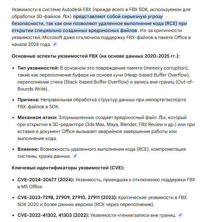 Насколько вообще актуальны уязвимости в формате fbx? Обычно открываю через blender, но почему microsoft со своим "3д просмотрщиком" так трясется и не фиксит уязвимости, тупо отклчает поддержку, неужели настолько повально распространялась вирусня через fbx? Сам частенько качаю 3д модели для тренировки и изучения как раз с торрентов. "Уязвимости в системе Autodesk FBX (прежде всего в FBX SDK, используемом для обработки 3D-файлов .fbx) представляют собой серьезную угрозу безопасности, так как они позволяют удаленное выполнение кода (RCE) при открытии специально созданных вредоносных файлов. Из-за критичности уязвимостей, Microsoft даже отключила поддержку FBX-файлов в пакете Office в начале 2024 года. Основные аспекты уязвимостей FBX (на основе данных 2020-2025 гг.):
