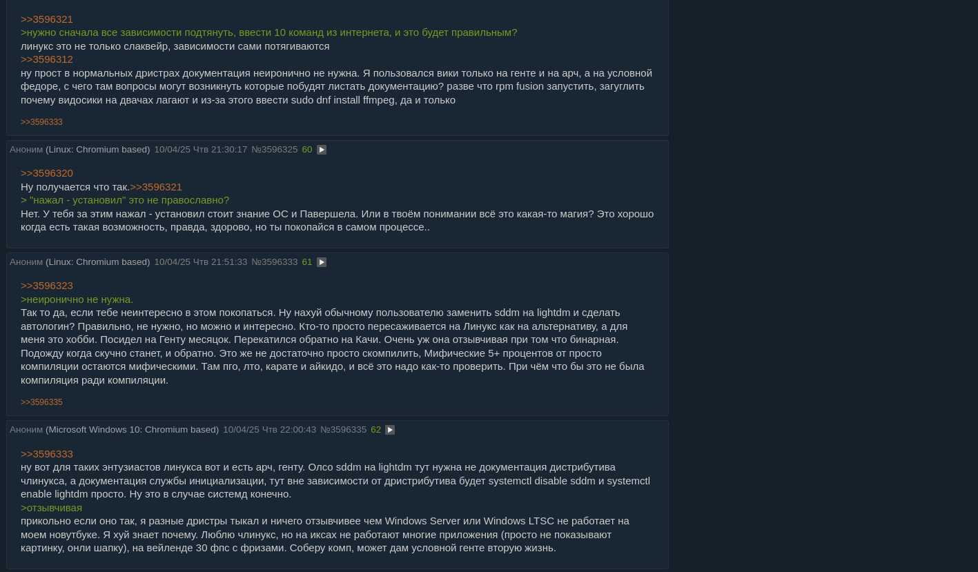 >>3596323 >неиронично не нужна. Так то да, если тебе неинтересно в этом покопаться. Ну нахуй обычному пользователю заменить sddm на lightdm и сделать автологин? Правильно, не нужно, но можно и интересно. Кто-то просто пересаживается на Линукс как на альтернативу, а для меня это хобби. Посидел на Генту месяцок. Перекатился обратно на Качи. Очень уж она отзывчивая при том что бинарная. Подожду когда скучно станет, и обратно. Это же не достаточно просто скомпилить, Мифические 5+ процентов от просто компиляции остаются мифическими. Там пго, лто, карате и айкидо, и всё это надо как-то проверить. При чём что бы это не была компиляция ради компиляции.