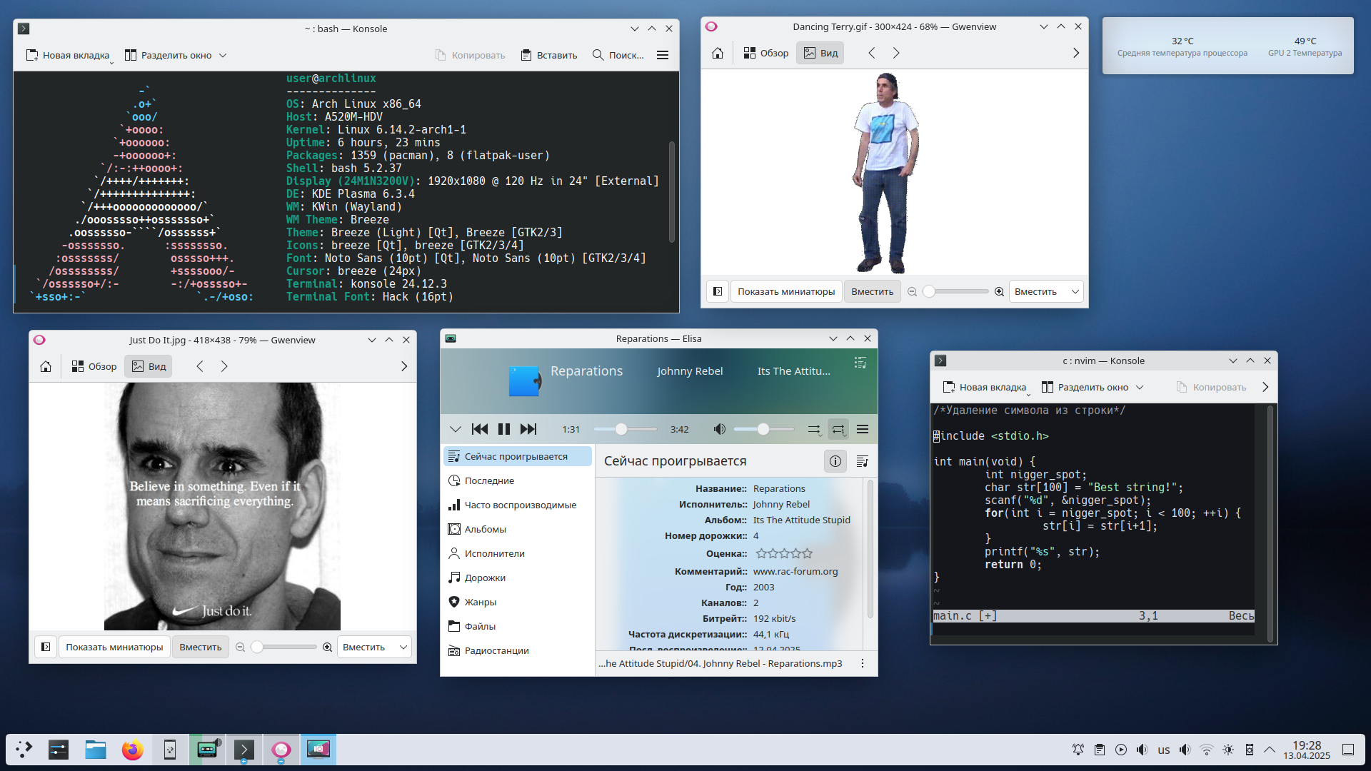 >>3596335 >systemctl disable sddm и systemctl enable lightdm просто Ну да, И задаваясь такими вопросами ты узнаешьё что мало просто установить софтину, есть ещё сервисы. И как с ними работать, где находятся файлы настроек. >прикольно если оно так, я разные дристры тыкал и ничего отзывчивее чем Windows Server или Windows LTSC не работает на моем новутбуке А, ну там просто репы типа znver4, которые как раз под мой проц. На Форониксе были тесты на эту тему. На игры это в бенчмарках. Но то , как в целом себя система ведёт - мне прям нравится. В синтетике есть разница. По-хорошему надо поставить Федору и Нобару И проверить. Ставил тут Пику. Что б земля мёдом не казалась - ещё и с Хайпром. Ох, лучше б не ставил. С Арчём Хайпр так плохо себя не вёл. Решил воткнуть кеды - Сорян, мы не можем, у нас тут конфликт зависимостей. Ну и представь моё ебало, когда год сидел в основном а Арче? Каво? В смысле не получается поставить другой ДЕ? Какой конфликт?