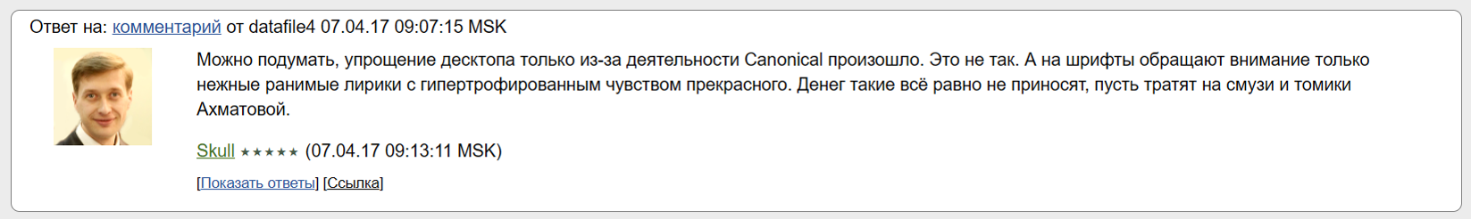 Я хз как вы терпите эти уебищные шрифты в линухе, у меня кровь из глаз нахуй. Особенно всрато это выглядит в тёмной теме. Чем вообще занимаются люди, которые развивают эту хуйню? Это ведь буквально первое, что бросается в глаза и портит всякое впечатление. Почему они не могут высрать что то вроде clear type в винде или такое же сглаживание, как в маке? Серверная хуета непригодная даже для серфа в сети, пиздец просто.