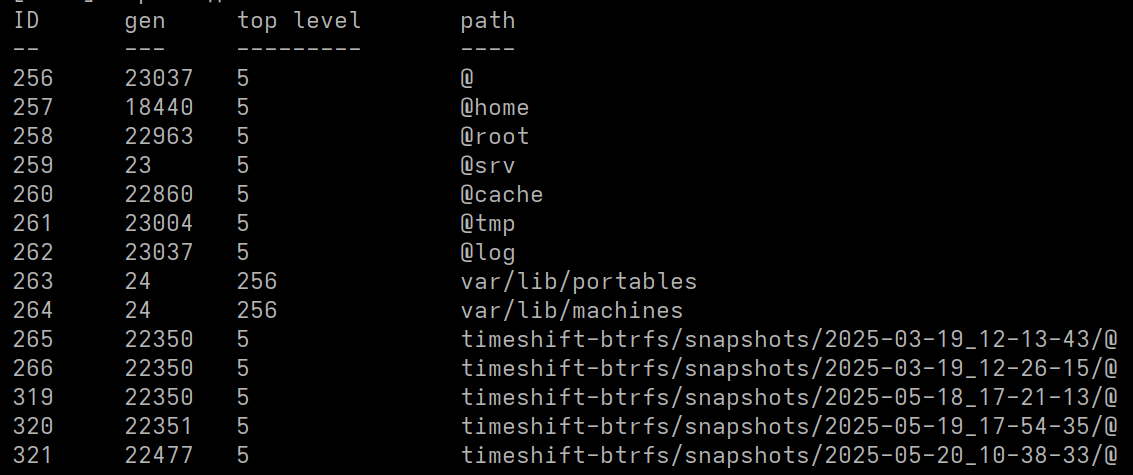 Можешь скопипастить subvolume list -t / плз