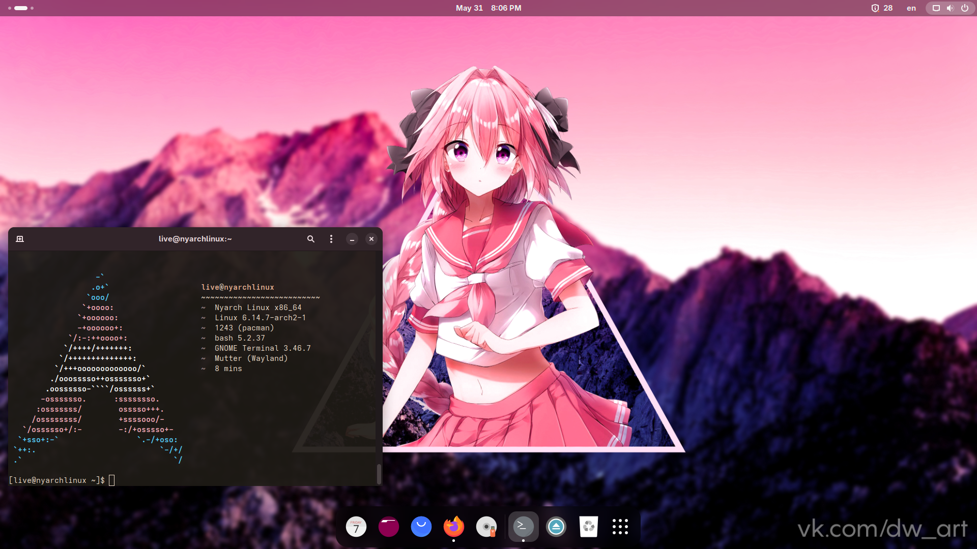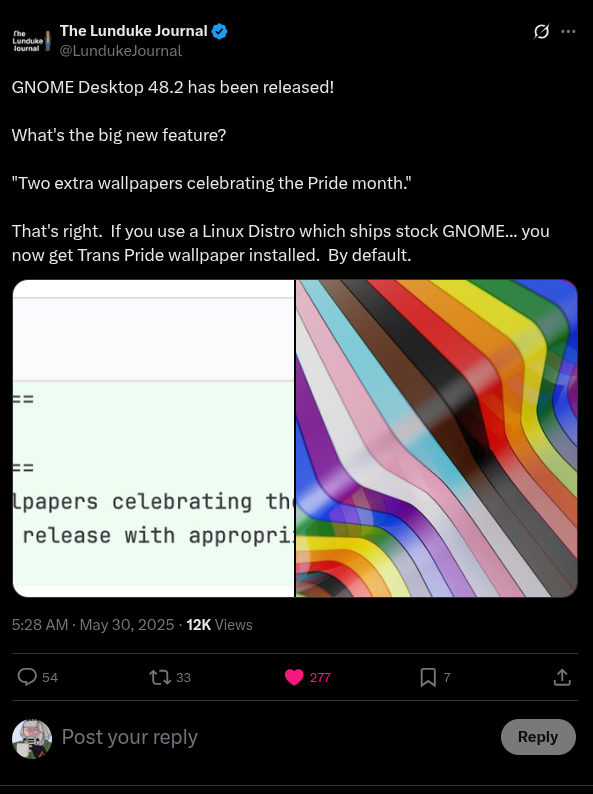 >>3609385 → Наверное соглашусь в некоторых аспектах по четвертому гному что он выглядит так себе. Хотя в целом я не считаю, что гном это калька с макоси как заявляли в прошлом треде. Гном из коробки это весьма минималистичное окружение, в котором мало что собственно есть и ты добавляешь расширениями что надо и тут уже можно допускать самые разные вариации того как гном будет выглядеть. Впрочем из-за того что гномовские приложения дрочат либадвайту они все выглядят +- также. Поэтому функциональность то может и отличаться а вот внешний вид как-то не особо. С кедами получше в этом плане, а из GTK мне нравится только крыска, но ее на вейленде просто нет, печально.