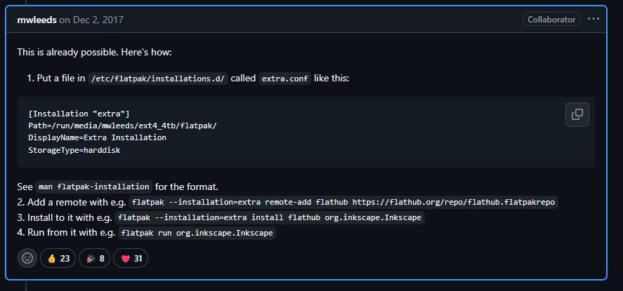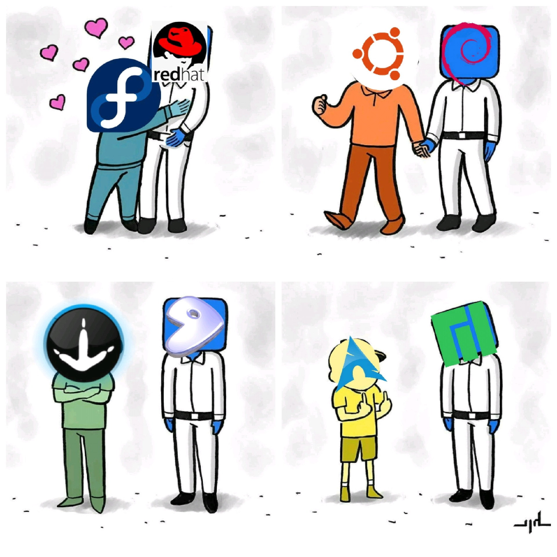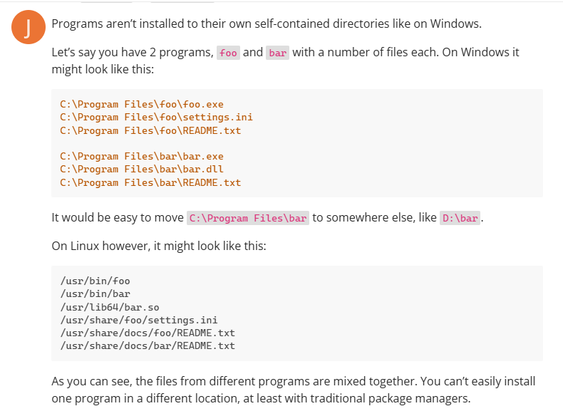 >>3610793 По причине дососпецифичный костыль который и в винде-то без толку, ещё на хп могли от него целиком отказаться, но почему-то вместо одного лишь некроёб/госзаказ/военка эдишена потащили это во все остальные релизы. > и я не могу просто выбрать путь установки для программы Можешь, правь мейкфайл или манифест в пакете и ставь куда хочешь, только в $PATH не забудь добавить или симлинку сделать. Хоть тарбол раззипуй в папку с загрузками и оттуда запускайся. > пример Пример говно, давай заново > чтобы установить программу в кастомную директорию надо писать какие-то конфиги Чтобы установить программу не в програмфайлс тоже надо писать конфиги или мастерить инсталлер который городит все нужные симлинки и ярлыки > и вообще всё это не юзерфрендли sudo apt install peepeepoopoo, после этого оно доступно из консоли, с рабочего стола, из пуска, из астрала, откуда угодно. Чего тут не юзерфрендли? Неюзерфрендли это каждую системную папку по разным партишенам распихивать а потом жаловаться что жёпу жжёт > flatpak пакеты и похожие технологии, которые хранят в себе все зависимости Не хранят, так же срут в систему, но не файлами, а пакетами с файлами тысячи разных версий, прям как эти ваши тридцать версий дотнета на винде которой пользуются хотя бы полгода. > это всё равно какая-то ебля Которую устроил ты сам. Нормальный пользователь делает один здоровенный раздел и держит свои файлы в своём хомяке, а сторонние диски подключает под какую-нибудь конкретную цель, а не так чтобы полсистемы туда сгрузить и коллекцию нарезок с рен-тв и сидеть искать почему вдруг фризы начались
