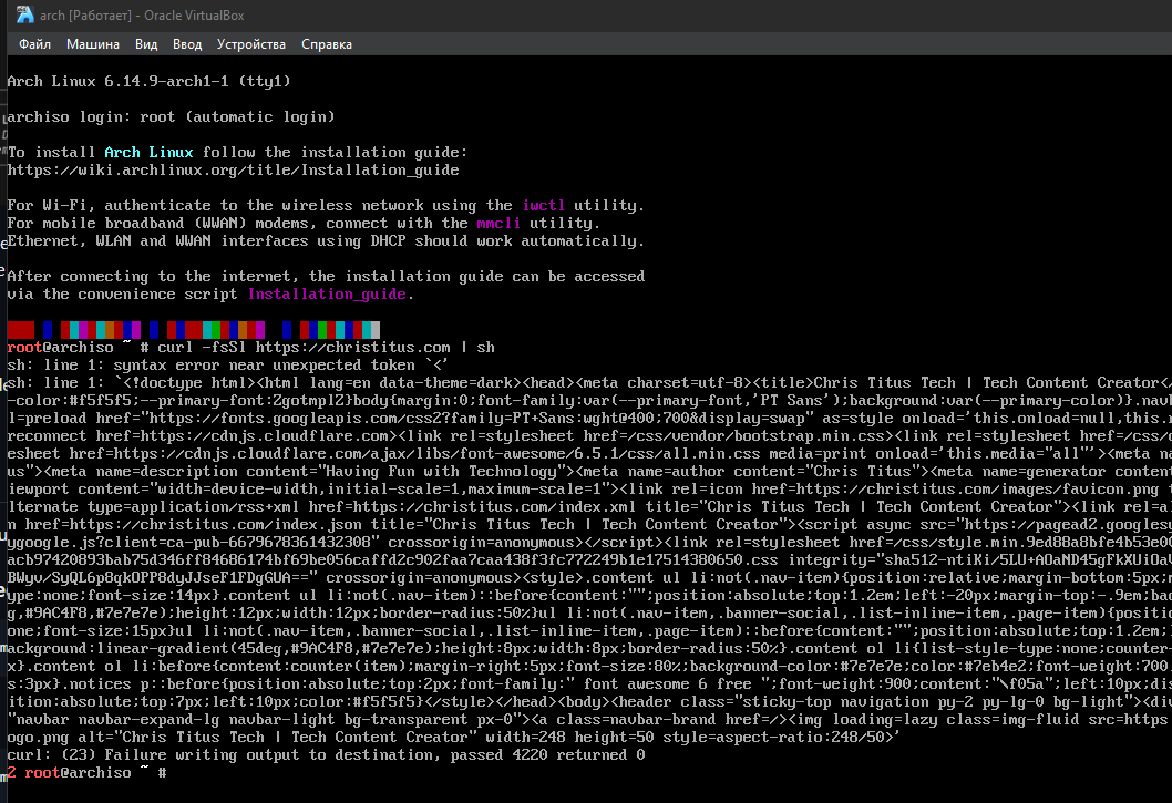 Сегодня хотел попробовать арч, нашел на ютубе гайд какого-то чела, который предлагает свой скрипт, чтобы все быстро поставилось, я подумал, почему бы и нет, запускаю виртуалку, вижу консольку, пытаюсь ввести команду для запуска его скрипта curl -fsSL https://christitus.com/linux | sh, дохожу до палочки и понимаю, что я хуй знает как её ввести... Ладно, нагуглил, шифт +слэш, пытаюсь ввести, в итоге что-то идет не так, консоль ругается и перестает реагировать на нажатия кнопок. Ну, неплохо для первой попытки наверное...