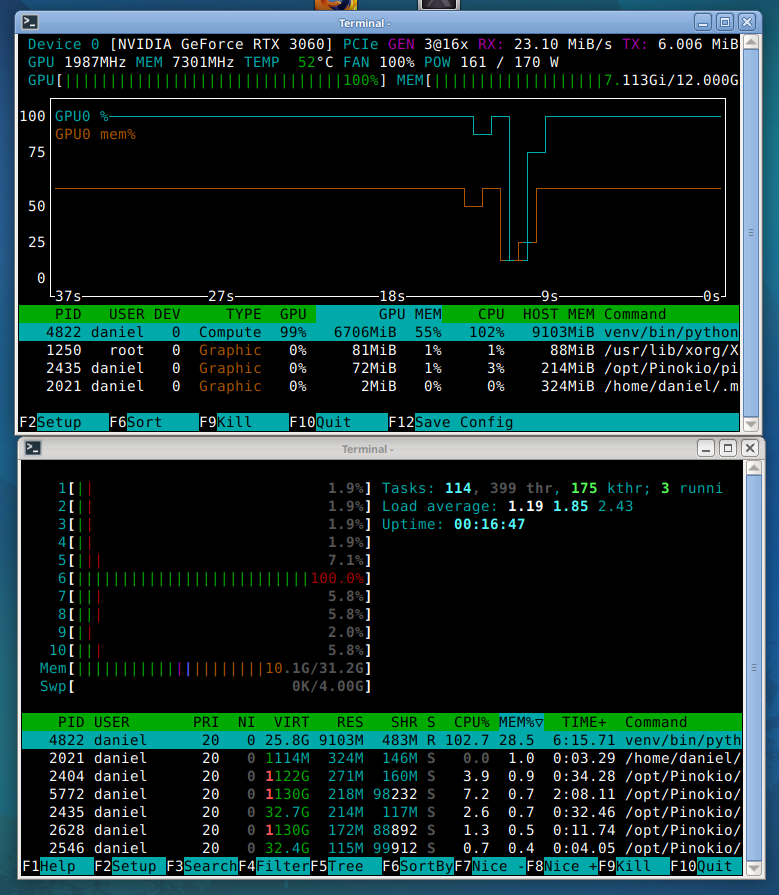 Можно ли один терминал разделить горизонтально, чтобы сразу наблюдать два процесса? Вроде через screen это делается но нихера не могу найти готовой команды. Нужно одновременно запустить nvtop и htop.