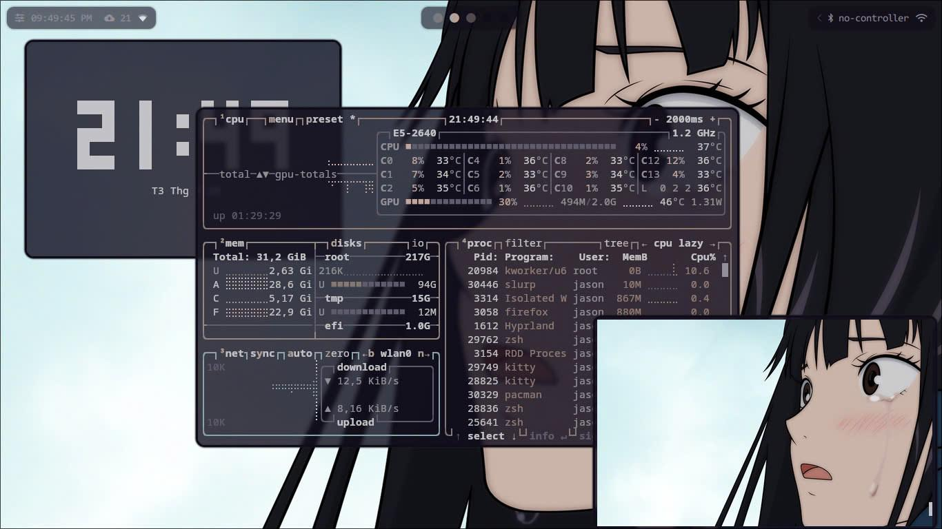 Ну разве может это какой-то статичный интерьерный сетап который раз настроил и забыл, типа в одном углу плеер с плейлистом и визуализацией, в другом погода, в третьем неофетч лол)
