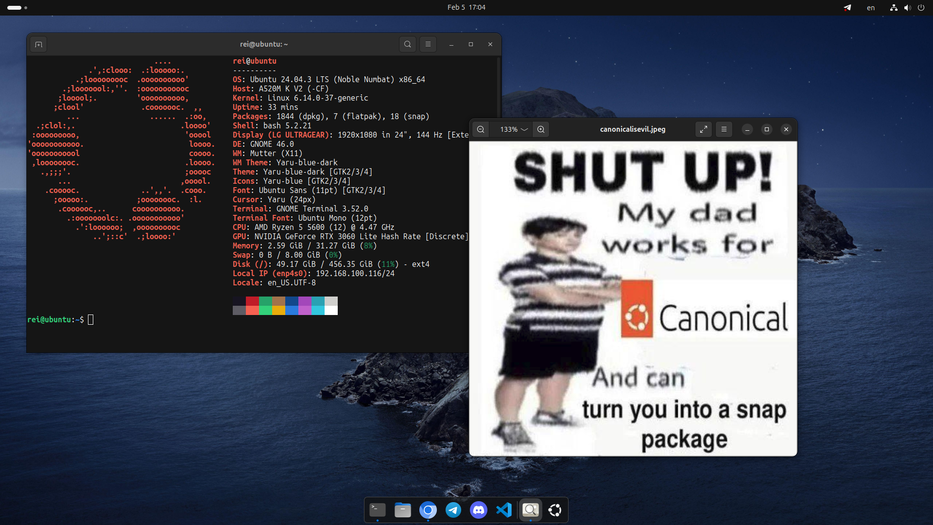 >>3589431 Ага, как Винда, только не Винда. Ты почти что победитель по жизни. В unixporn только не лезь. Там народ хотя бы pywal использует чтобы цвет консоли сочетался с обоями, была прозрачность, подбирают обои так чтобы прозрачность не мешала различать текст. И всё дефолтное, на выбор: fastfetch, btop, cava, cmus, ranger, чё там ещё из прикольно-консольного есть? Я искренне рад что тебе кайфово пользоваться Минтом, но это не очень. И дело даже не в том что то что у тебя на скрине это плохо, оно должно быть просто функционально для тебя и вообще пофигу на остальных, а в том что ты стал соревноваться с Виндой на её поле.Тебе ну нужно сравнивать себя с сыном маминой подруги, тебе нужно быть сыном маминой подруги..