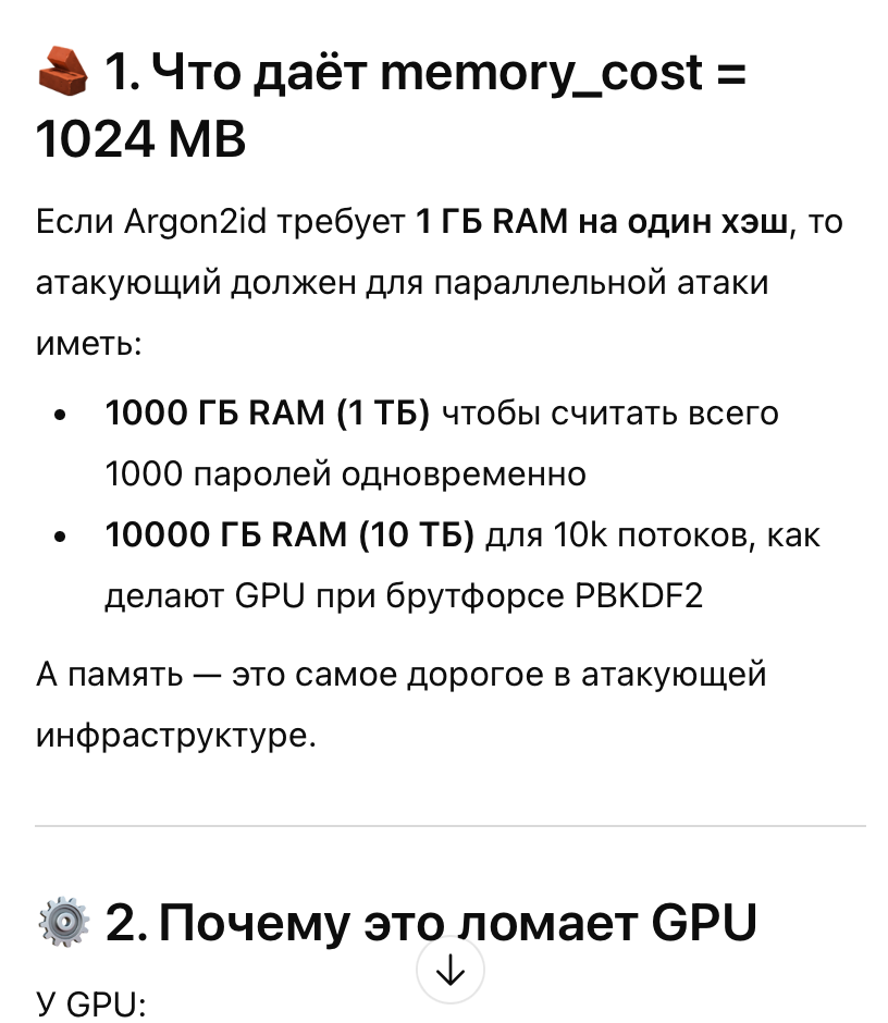 Допустим он брутфорсит все даты и прогоняет их через SHA256. Так как у меня только последние 50 символов, а не весь хэш, ему брутфорс прога выдаст "неправильный пароль". Пососал. То есть ему для каждого хэша нужно еще брутфорсить разные фрагменты этого кэша. А я в добавок хочу прогнать 2-3 раза через разные алгоритмы. И каждый раз хочу прогонять разные части хэша, например сначала первые 50 символов, потом последние 50 и как итоговый пароль берем последние 50 символов после 3 прогонов через тот argon2id как вы сказали. Это ж имба, которую невозможно перебрать. И главное: очень легко запомнить. дата рождения -> SHA256 -> последние 50 символов в argon2id --> первые 50 символов в Base64 --> последние 50 символов наш пароль.