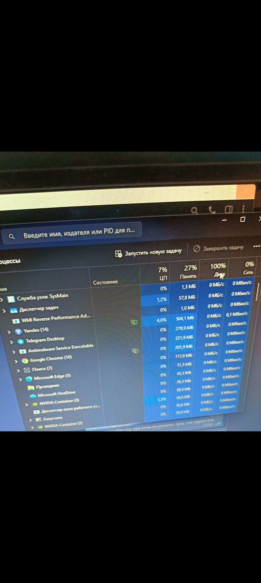 Проблема на винде 11. Ссд грузит на 100%, нет процессов которые грузит его. В мониторинге ресурсов аналогично. Проверка на вирусы — чисто. Замена ссд — повторение проблемы. Смена сата кабеля — проблема осталась. Отключение SysMain — не помогает. Снос винды — через время проблема вернулась. Другой порт для подключения — ссд проблема актуальна. Состояние диска 100% по инфе от crystaldisk.