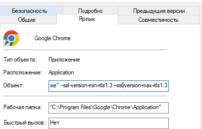 Будет что то из типа "C:\Program Files (x86)\Google\Chrome\Application\chrome.exe" --ssl-version-min=tls1.3 --ssl-version-max=tls1.3