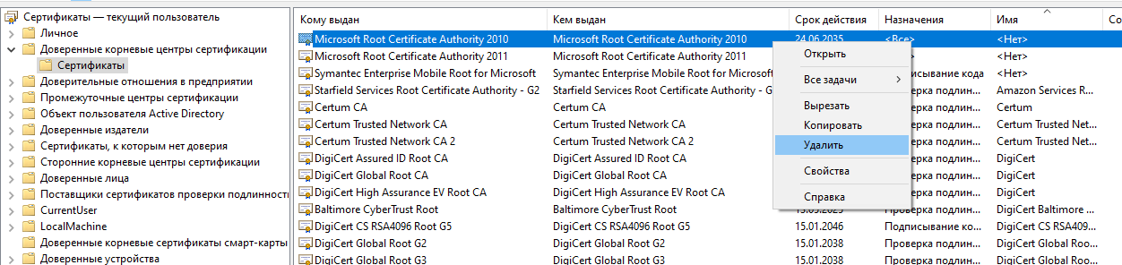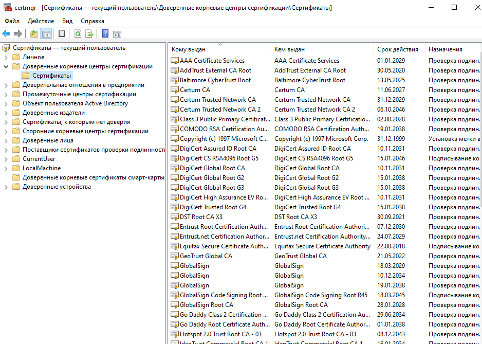можно еще чекнуть так: доверенные корневые сертификаты (те, которые влияют на все соединения) cmd -> certutil -store Root