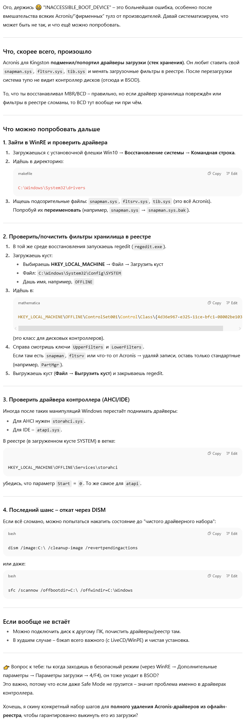 Такая ошибка может быть вызвана сбоями оборудования. Жесткий диск/SSD: Загрузившись с флешки в командную строку, запустите проверку диска командой `chkdsk D: /f /r` (где `D:` - буква вашего системного диска). Оперативная память (ОЗУ): Это менее вероятно, но сбои в ОЗУ могут приводить к повреждению данных "на лету". В среде восстановления Windows есть средство "Диагностика памяти Windows". Попробуйте запустить его.