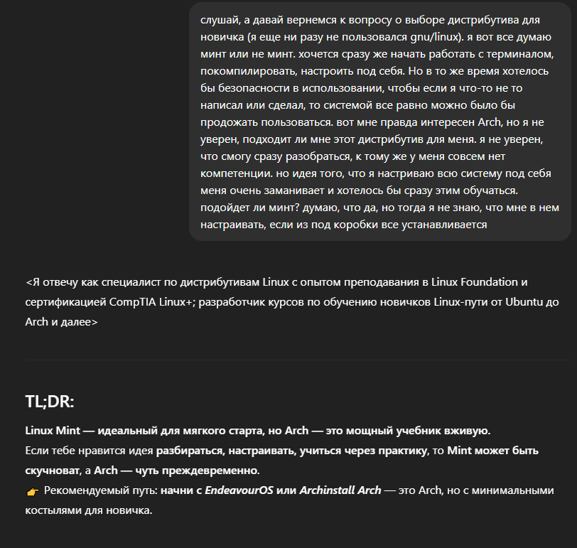 Привет, я тут решил вкатиться в GNU/Linux и спросил ChatGPT. Можете подтвердить правоту в его ответе? Или посоветуйте дистрибутив сами.