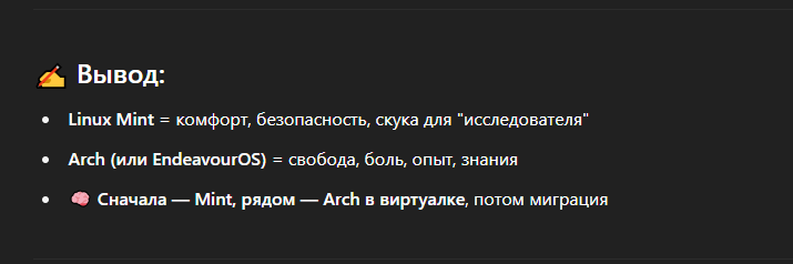Я реально сомневаюсь насчет выбора Mint, но может он все же необходим, чтобы для начала просто потыкаться в системе? С виндой я давно на "ты" и она скучная. Сижу на LTSC, знаю про активацию, полезный софт, немного лазил в реестре по гайдам. Я конечно не гуру виндовс, но и не средний юзверь, который не знает как поставить ос/драйвера/квн и пользуется яндекс браузером.