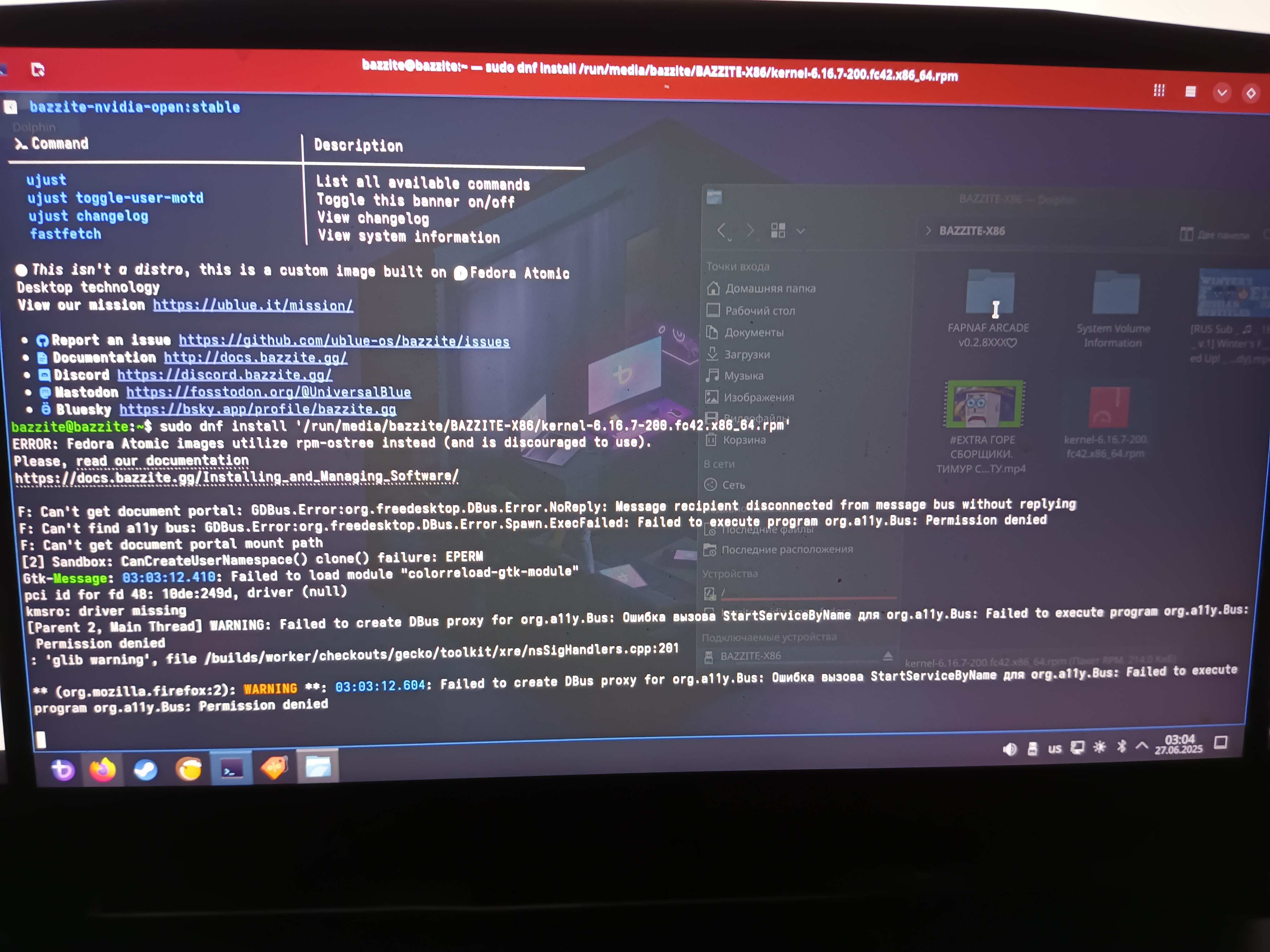 >>3640347 sudo rpm-ostree override replace \ ./kernel-6.16.7-200.fc42.x86_64.rpm \ ./kernel-core-6.16.7-200.fc42.x86_64.rpm \ ./kernel-modules-6.16.7-200.fc42.x86_64.rpm \ ./kernel-modules-extra-6.16.7-200.fc42.x86_64.rpm И еще докачай остальные модули и потом делай так.