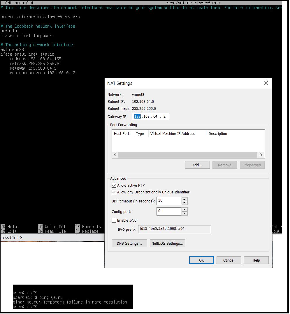 Аноны, почему не работает сеть в vmware? Для виртуалки в гипервизоре указан nat, но в настройка самой виртуалки указал статику из подсети nata. И эта залупа не работает. Не понимаю почему?