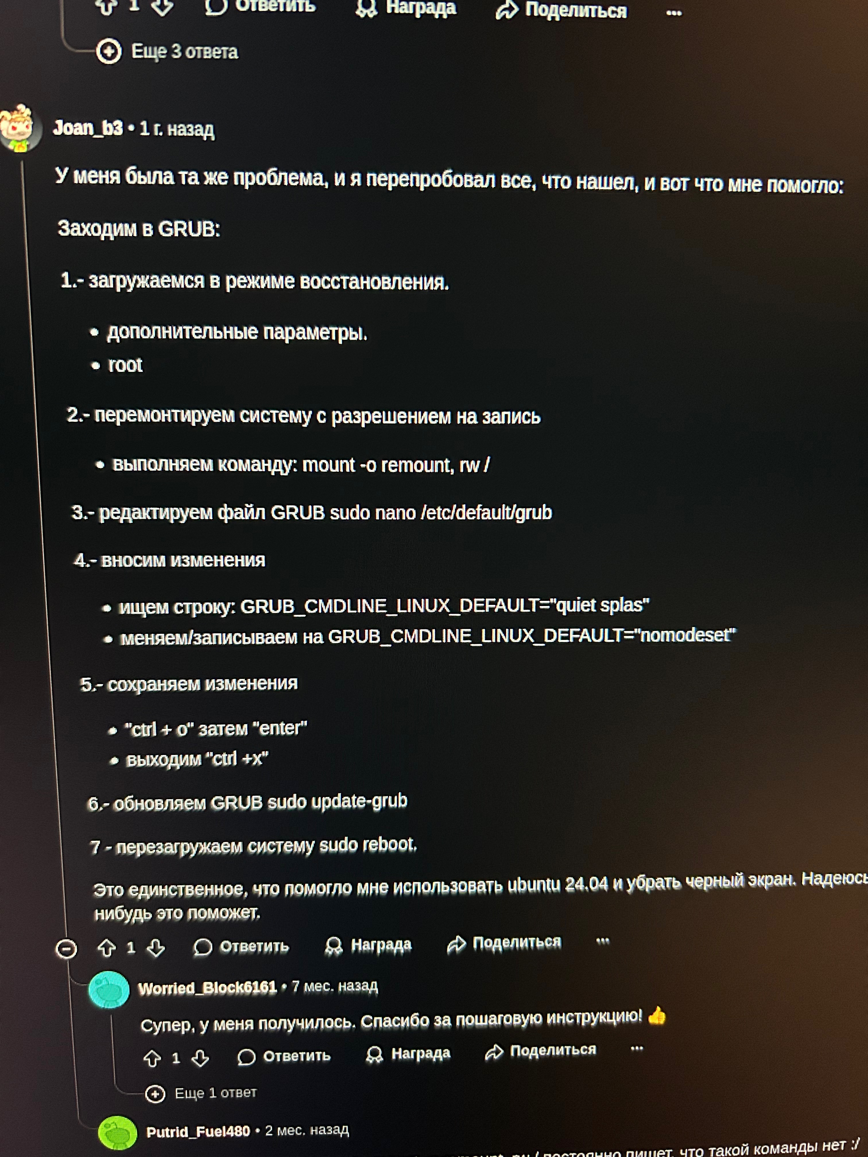 Черные экраны вместо экрана логина. То есть там где-то система работает, методом тыка я иногда могу в нее зайти, но изображения никакого нет. Сама система работает при этом потом нормально. Сделал хуету с пика, как единственное, что попалось адекватное в Гугле, но не помогло. Что делать, мужики?